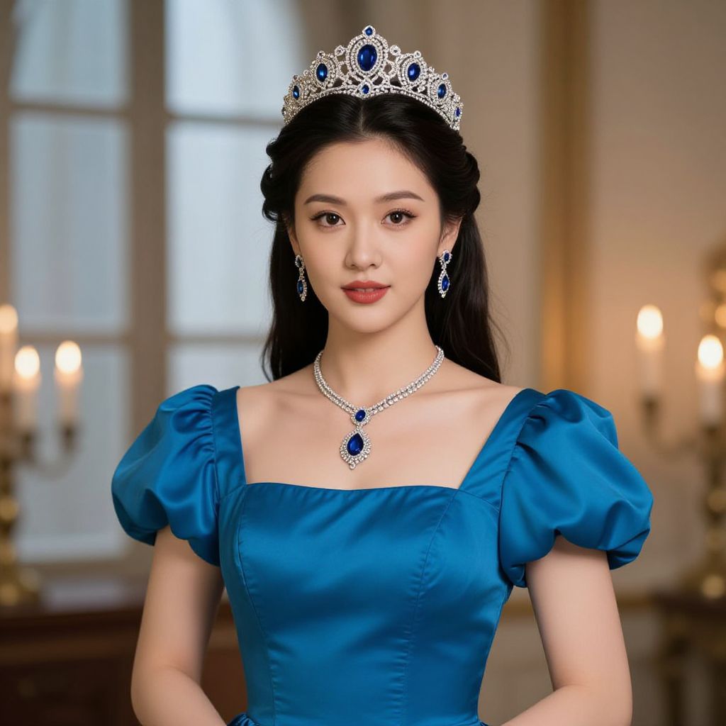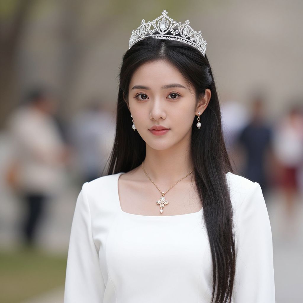 Photograph of an East Asian woman with long black hair, wearing a silver tiara and a white, long-sleeved dress. She has fair skin, delicate features, and is looking directly at the camera with a neutral expression. She wears pearl earrings and a matching necklace with a floral pendant. The background is blurred, showing an outdoor setting with indistinct people and trees. The overall style is elegant and formal, with a focus on her regal appearance. The image has a soft, natural light.