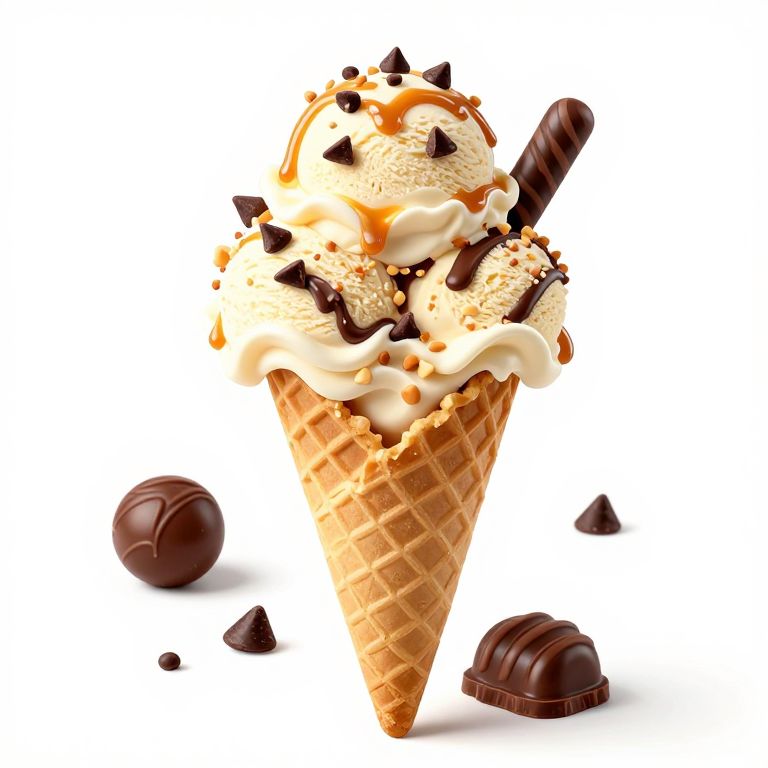 The image showcases a super-realistic, delicious vanilla ice cream cone with chocolate swirls and crushed peanuts, isolated on a white background. The cone is adorned with three generous scoops of creamy vanilla ice cream, each topped with a drizzle of rich caramel sauce and a scattering of chocolate chips. The cone itself is a classic waffle cone, with a golden-brown texture and a slightly crinkled surface. Surrounding the cone, there are various chocolate pieces, including a smooth chocolate ball, a striped chocolate candy, and a few scattered chocolate chips. The scene is set against a stark white backdrop, which accentuates the vibrant colors and intricate details of the ice cream and its toppings. The composition is perfectly balanced, with the cone centrally positioned and the surrounding chocolate pieces arranged in a natural, organic manner. The overall effect is one of extreme realism and visual appeal, capturing the essence of a decadent, indulgent treat.