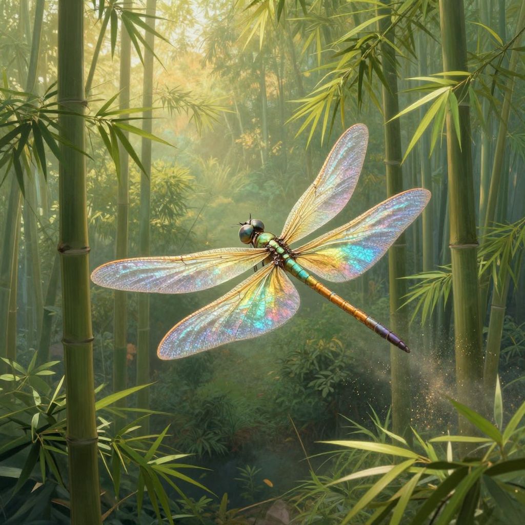 Craft an intricate digital painting depicting a mythical dragonfly with iridescent wings reflecting a spectrum of vivid colors, reminiscent of James Jean's detailed illustrations. Capture the delicate beauty and grace of this magical creature from an aerial viewpoint as it gracefully soars through a serene bamboo forest bathed in soft golden light filtering through the lush canopy. The tranquil yet mystical atmosphere evokes a sense of wonder and enchantment, with the dragonfly elegantly gliding over the verdant landscape while leaving a trail of luminous dust in its wake.