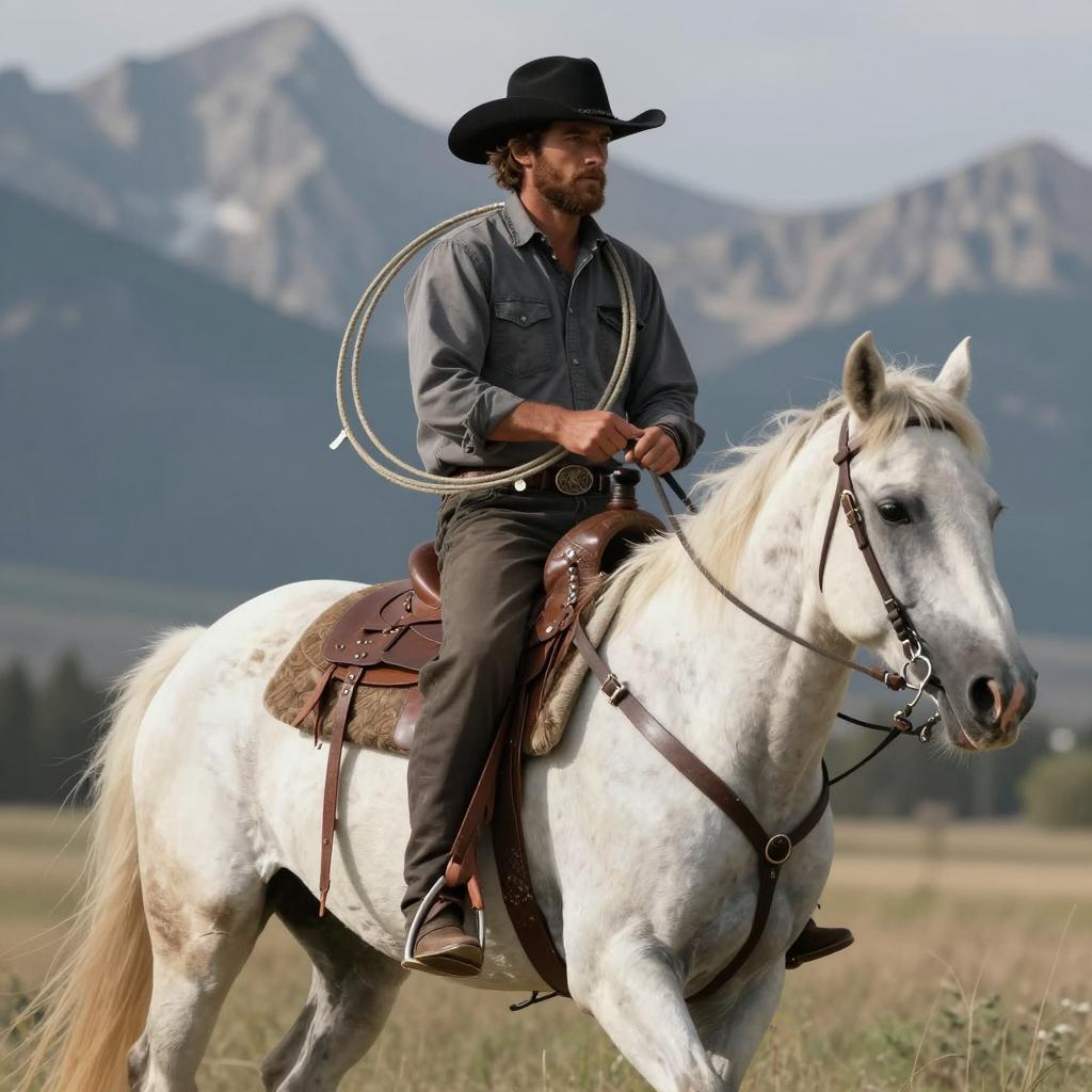 Cowboy Riding Two Horses Near Barn