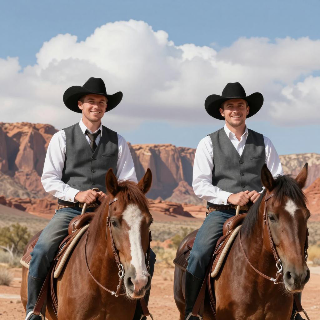 Man in cowboy hat, red shirt, brown vest, beige pants, riding two horses in front of a wooden barn. Brown horse on left, gray horse on right. Barn has a weathered exterior, small window, and a pile of hay. Clear blue sky, tree on left. Man holds reins, sits upright, facing forward.