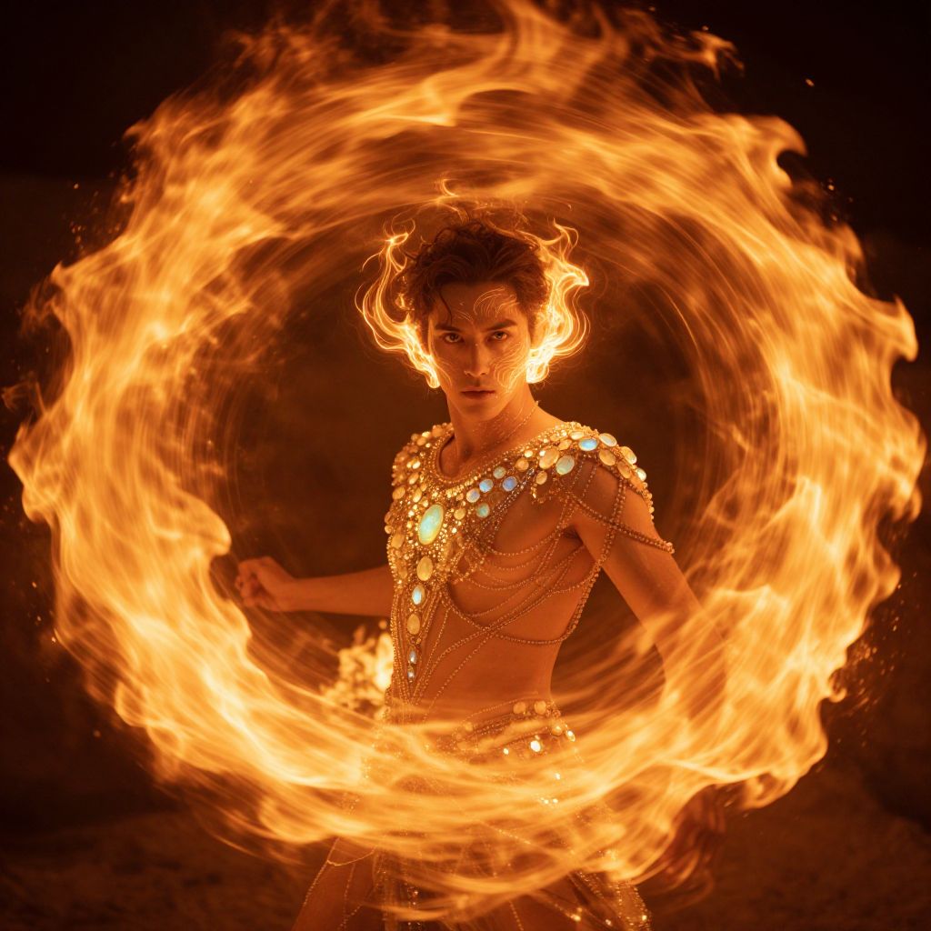 Enigmatic figure, lost in the swirling vortex of fire, his movements fluid as he twirls amidst the inferno, opal encrusted attire glistening like celestial jewels, radiant heat waves dancing across his face, mystical ambiance enveloping the surroundings, golden hour light casting an otherworldly glow. Man has masculine face and piercing eyes