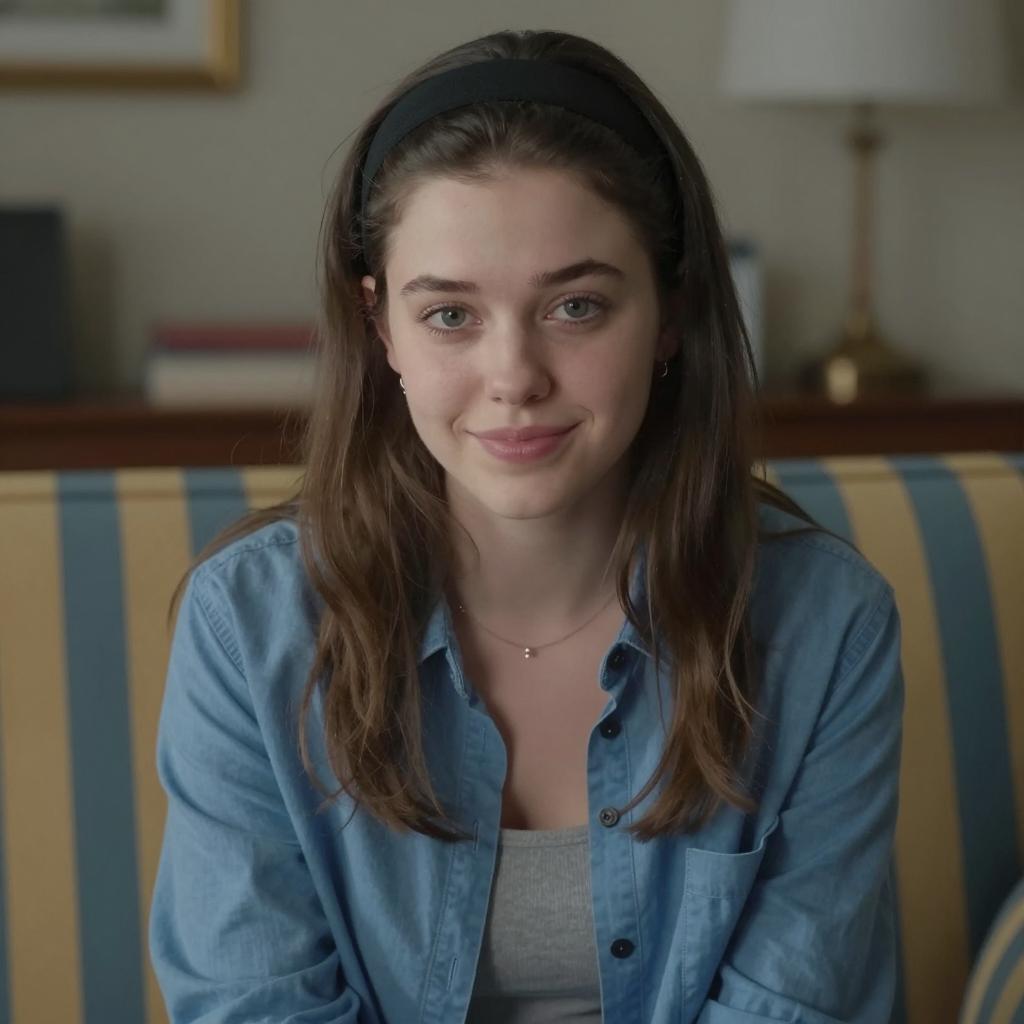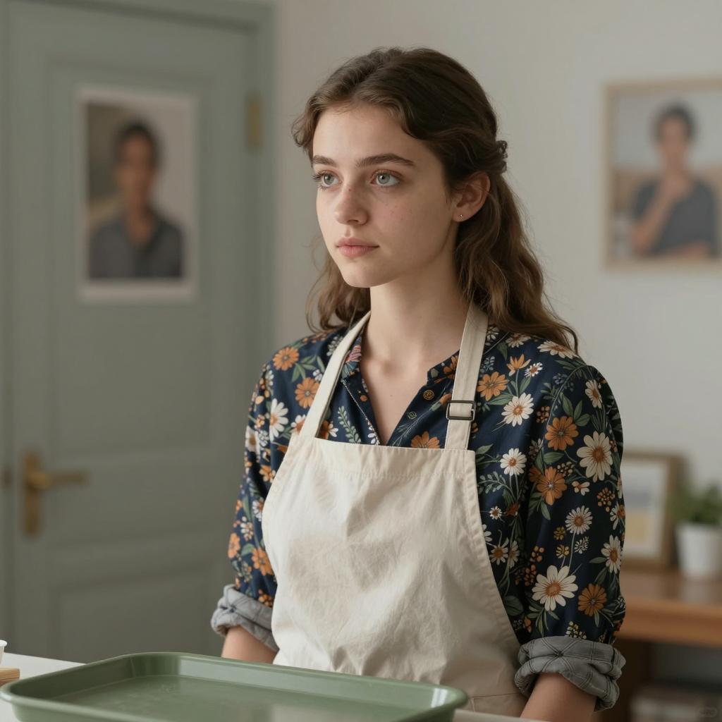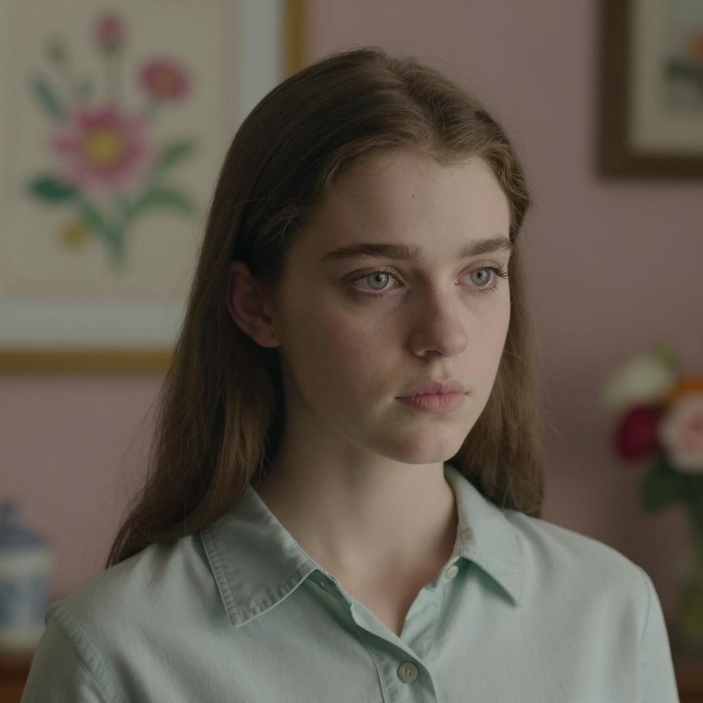 Photograph of a young woman with long brown hair, light green eyes, and pale skin, wearing a light green collared shirt. She has a neutral expression, looking slightly to the right. Background includes a framed, blurred floral drawing on a pink wall. Dimly lit room with floral decorations.