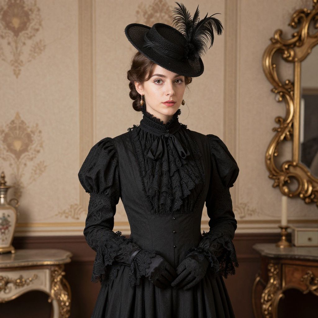 A woman dressed in an elegant Victorian-era black dress with puffed sleeves and lace cuffs, complemented by a high-collared blouse and a stylish black hat adorned with feathers. The detailed vintage wallpaper and ornate furniture in the background highlight the historical setting and classic fashion style.