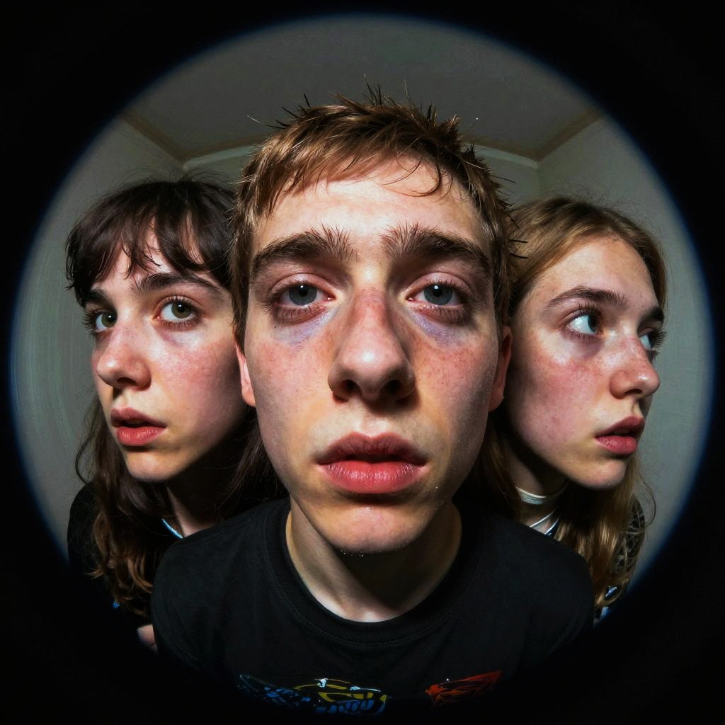 This photograph features a close-up, slightly fisheye-lens view of three young individuals with fair skin and freckles, positioned closely together. The central figure, a young man with messy brown hair and blue eyes, is in sharp focus, wearing a black shirt with a subtle graphic. On either side, two young women with similar features and dark, slightly wavy hair gaze off to the right. The lighting is bright but creates dramatic shadows, enhancing the texture of their skin and hair. The background is a simple, dimly lit room with white walls. The image has a circular vignette effect, drawing attention to the central subject.