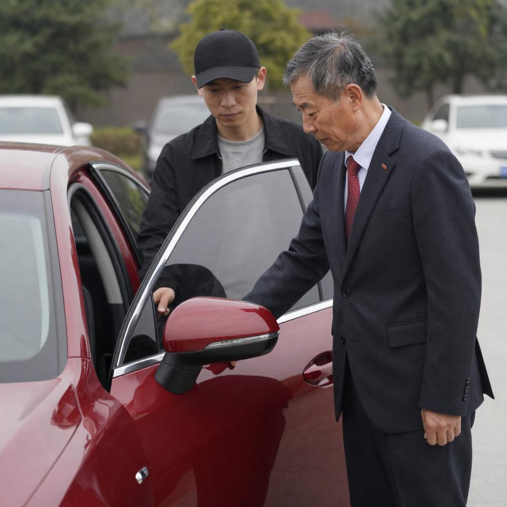 Photograph of two men standing on either side of a red Nissan car with a Japanese license plate. The man on the left wears a black suit, the man on the right wears a blue jacket and cap. Both men look at each other. The car is parked in front of a white fence.