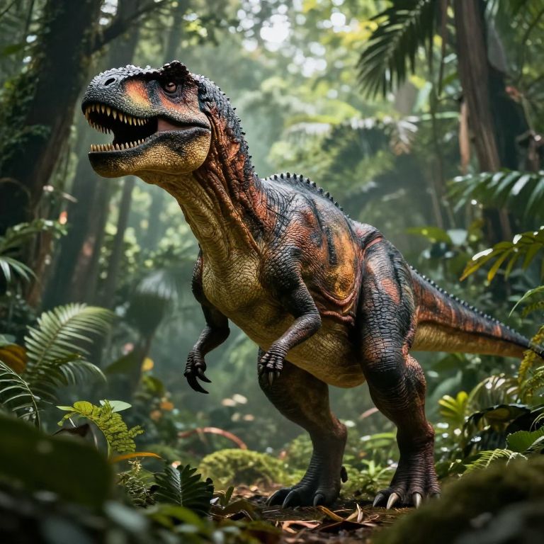 Create a animal inspired by prehistoric times, a fierce dinosaur-like creature with textured scales and sharp claws, emerging from a dense jungle environment, with realistic shadows and a smoky atmospheric perspective.