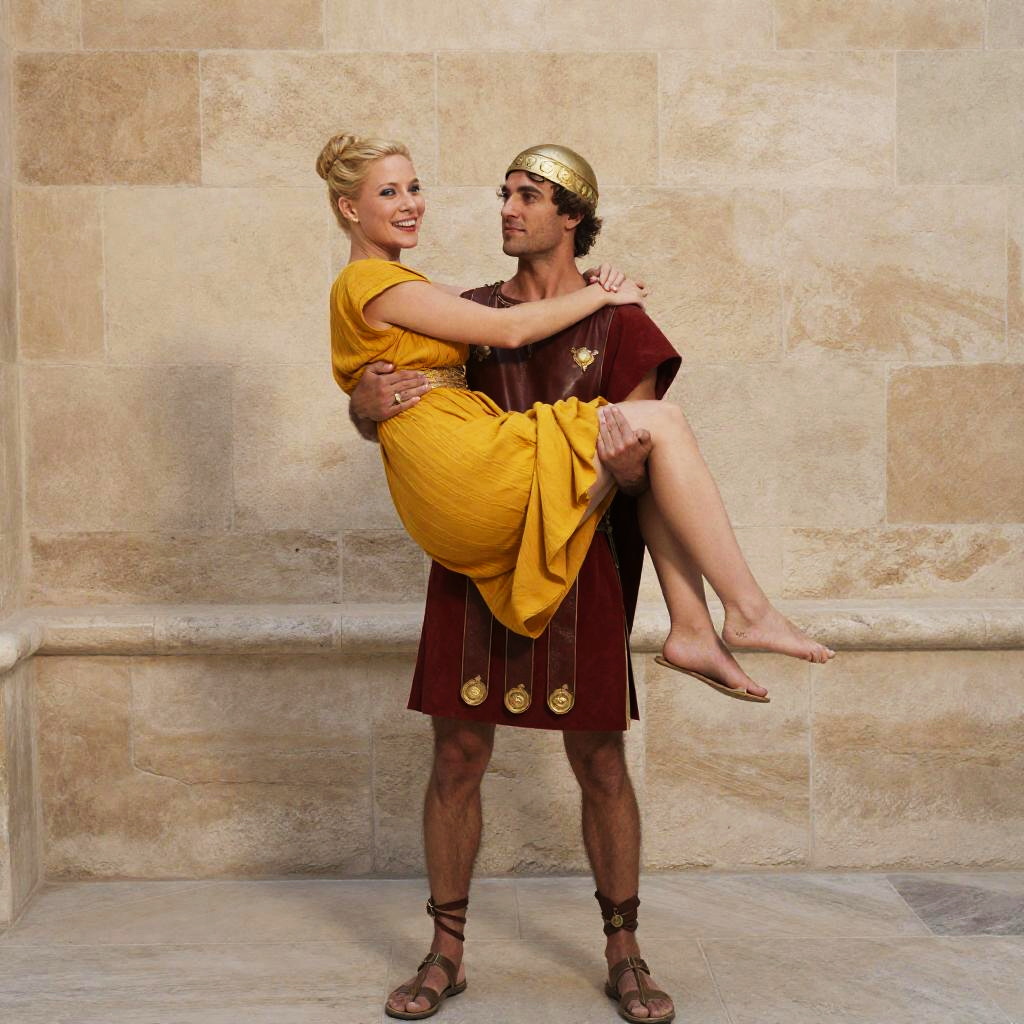 Photograph of a man and woman in ancient Roman attire. The man, wearing a red tunic, cap, and sandals, carries the blonde woman, in a yellow dress, over his shoulder. They stand against a stone wall. The woman's arms are around the man's neck, and she smiles. The man has a neutral expression. Both have fair skin. The woman's hair is styled in a bun. The background features ured stone bricks.