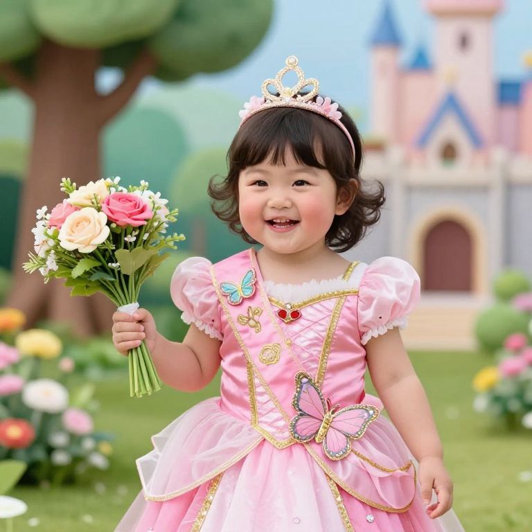 Photograph of an adorable Asian toddler girl with fair skin and black, wavy hair, wearing a pink, puffed-sleeve princess dress adorned with a gold butterfly and red gem embellishments, and a white tiara. She is smiling and holding a bouquet of white and pink roses with greenery. The background features a colorful, cartoon-style castle with blue and pink turrets, and a lush garden with vibrant flowers and greenery. The image is brightly lit with a clear blue sky. The girl's dress is detailed with gold trim and a matching butterfly accessory on her chest.