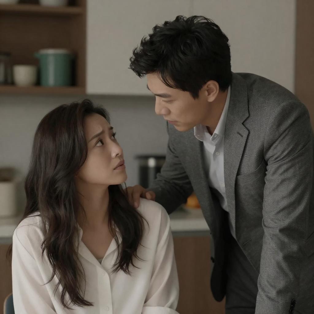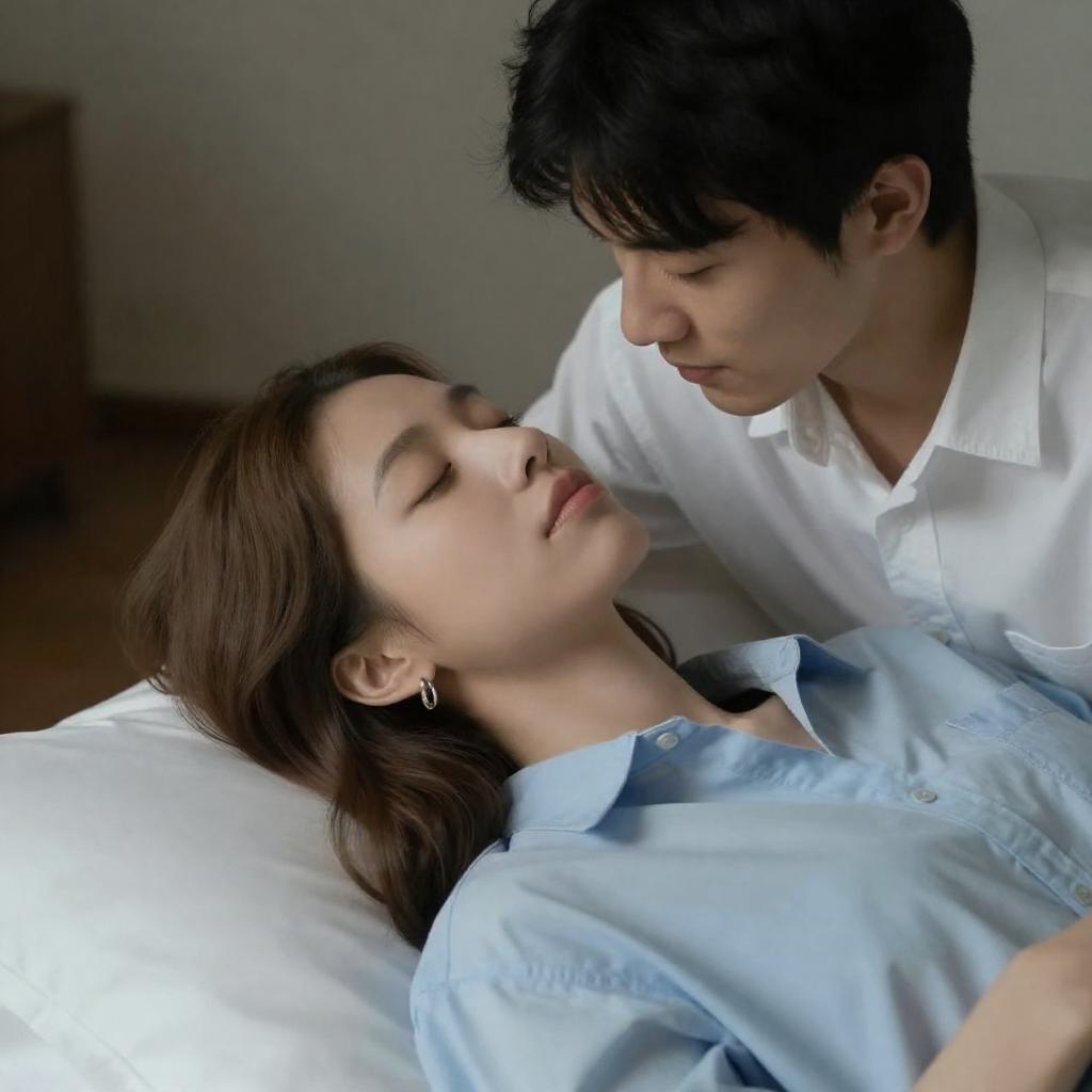 Photograph of a man and woman with dark hair, close to each other's faces, eyes closed, smiling softly. Man in brown jacket, blue shirt; woman in light blue shirt. Blurred indoor background. Man on left, woman on right. Intimate, gentle interaction.