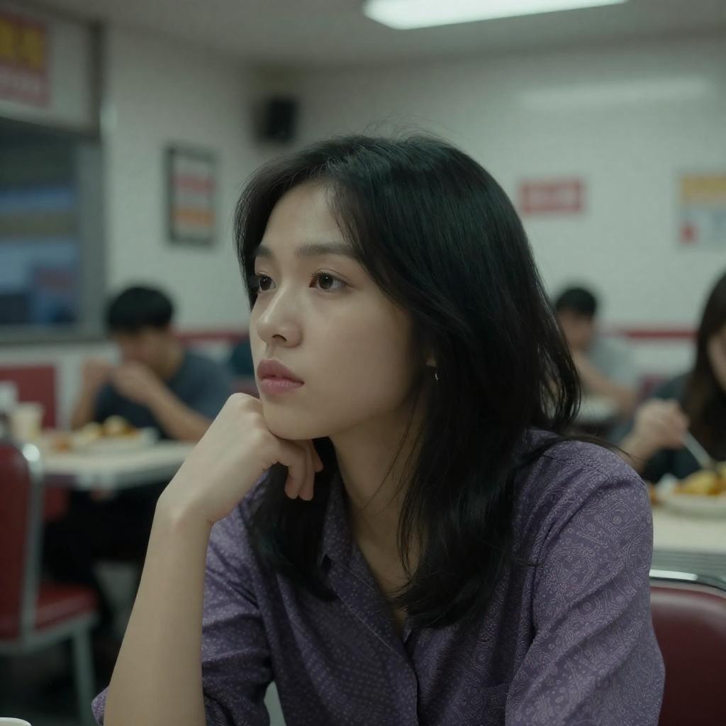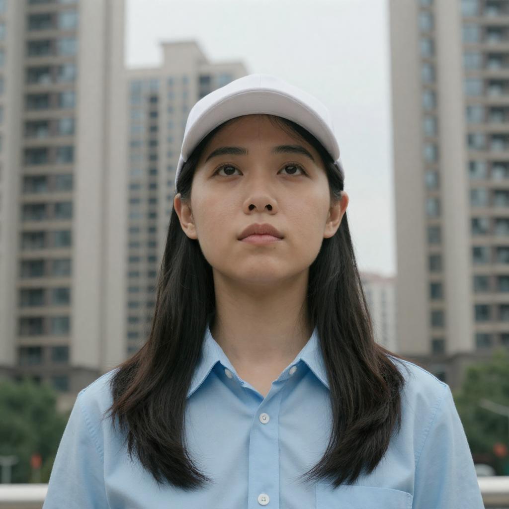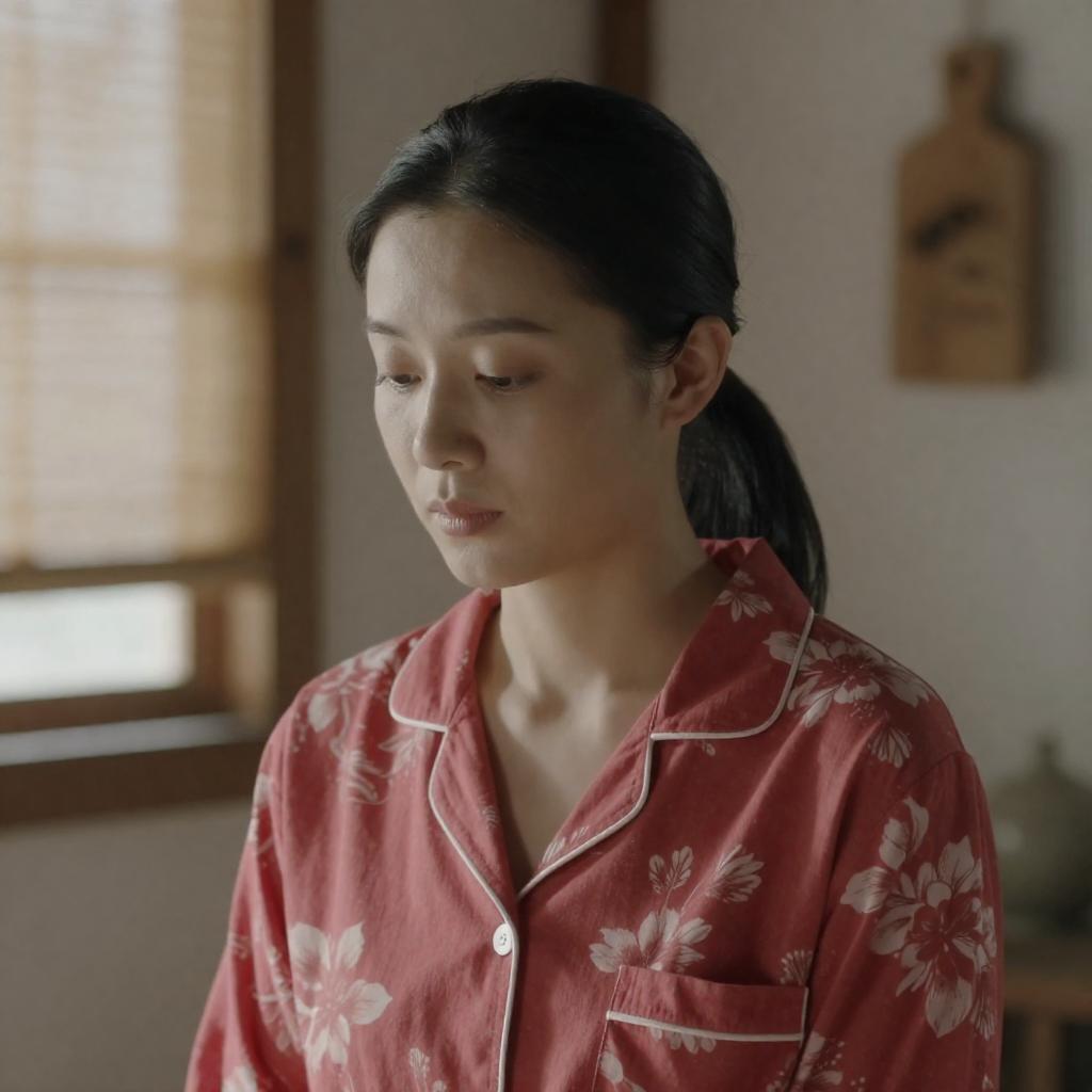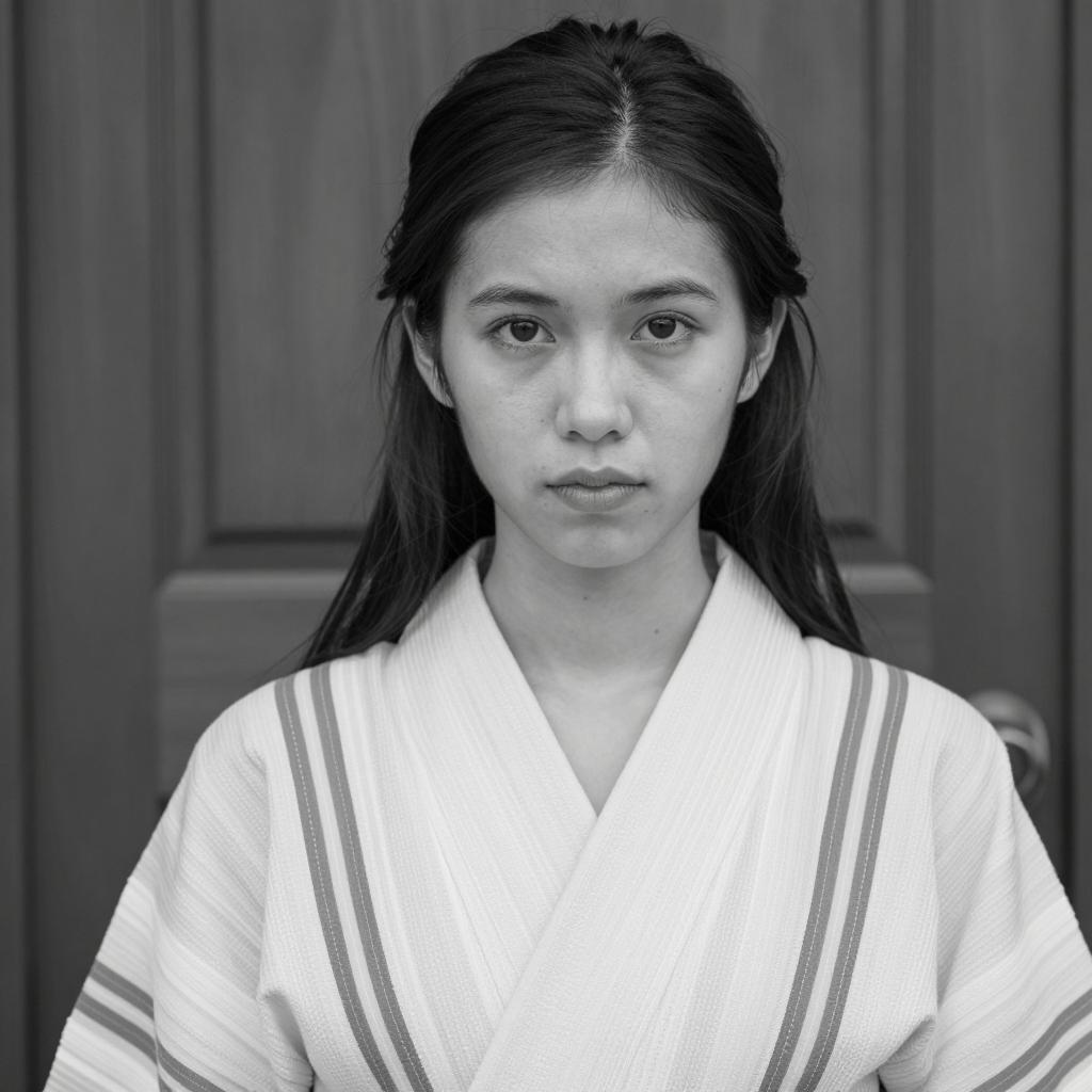 Black and white photograph of a young woman with medium-length dark hair, wearing a light-colored blouse and cardigan. She has a neutral expression, looking slightly to the right. Background is blurred, with indistinct shapes and shadows. She is centered in the frame.