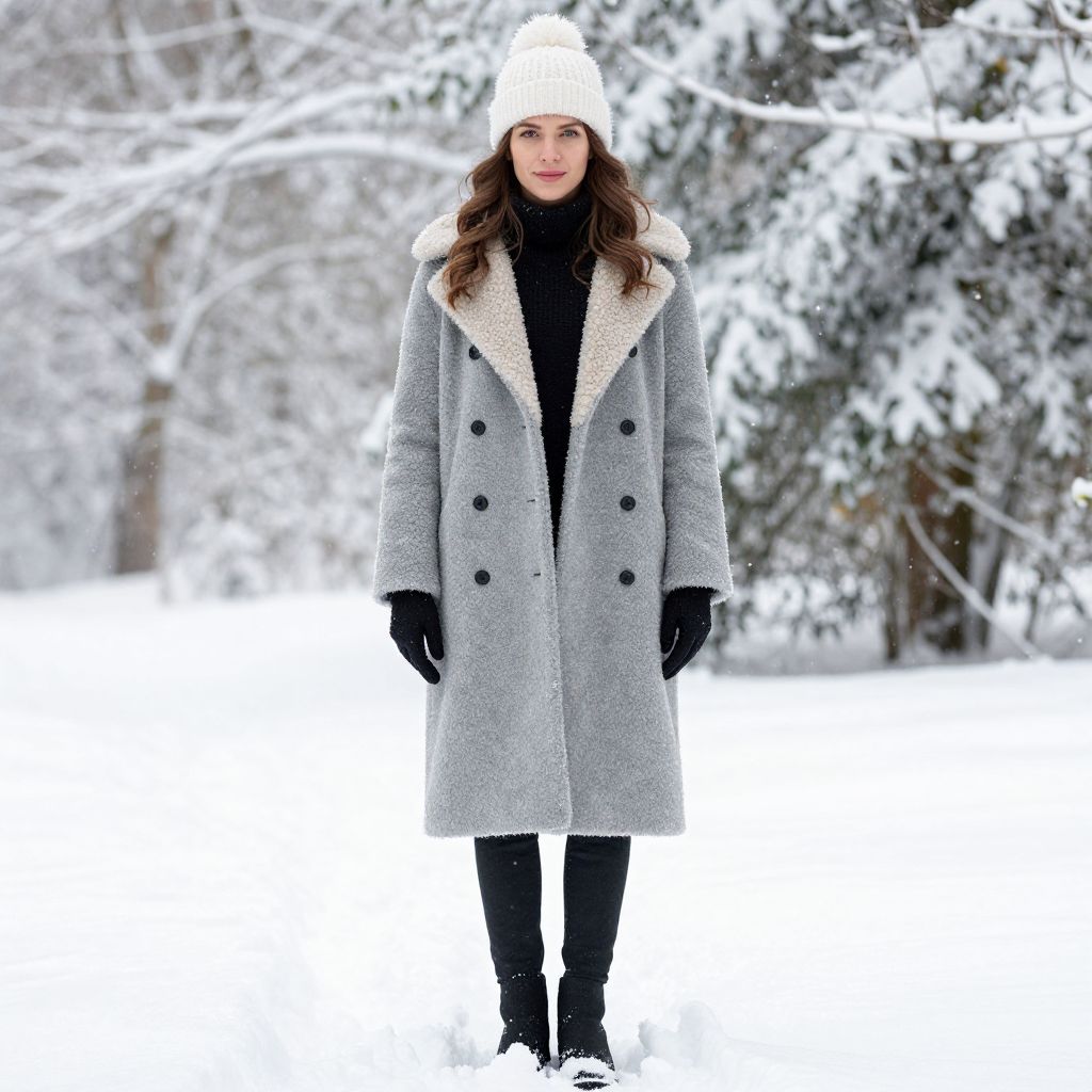 Photograph of a young woman standing in a snowy forest. She has long brown hair, fair skin, and wears a white knit beanie, black turtleneck, gray wool coat with black buttons and a cream-colored fur-lined hood, black gloves, and black pants. Snow-covered trees are in the background, with a blanket of snow on the ground. She stands centered, facing forward, with a neutral expression. The bright white snow contrasts with her dark clothing, making her stand out. The overall scene is serene and winter-themed.