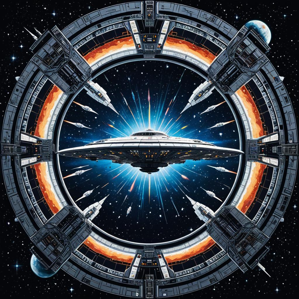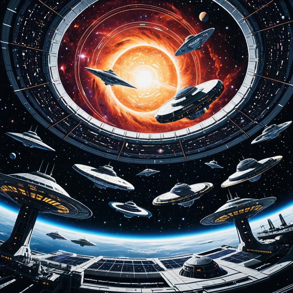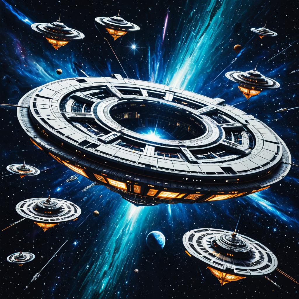 A vibrant cosmic background with a myriad of futuristic spaceships. These ships vary in design, color, and size. Some are sleek and streamlined, while others have intricate patterns and designs. The central focus is a large, circular space station with a unique, infinity-like shape. sleek crystalline shard ships, pulsating pulsar lightscape
