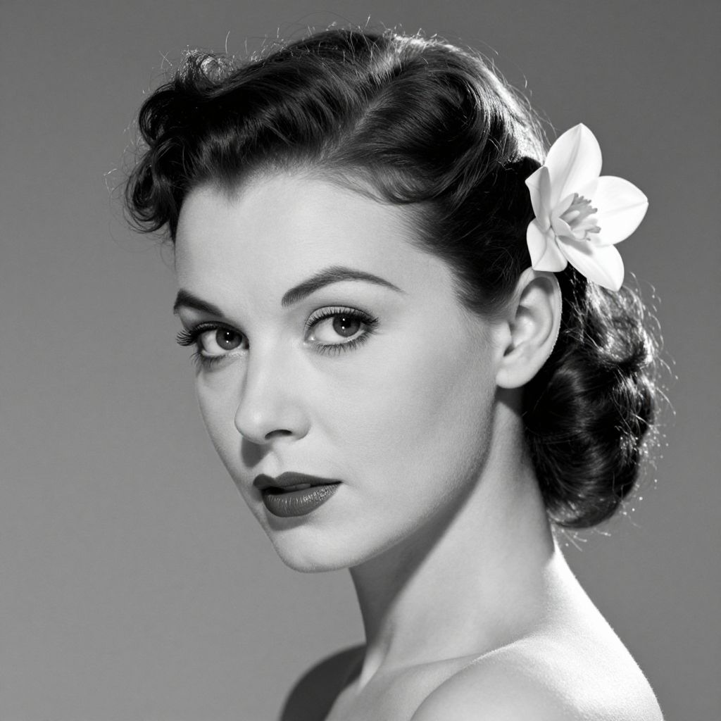 A vintage black-and-white portrait featuring a woman with a classic 1940s hairstyle adorned with a delicate white flower, captured in high-definition detail with dramatic lighting that accentuates her elegant features and timeless beauty.