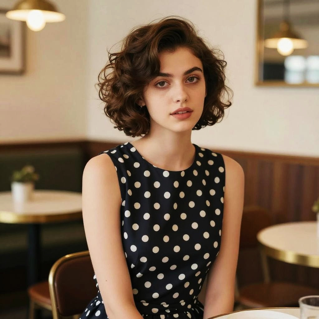 Bouffant hairstyle on fashion model, wearing chic wrap dress, in urban street cafe, captured in fashion editorial style with golden afternoon sunlight.
