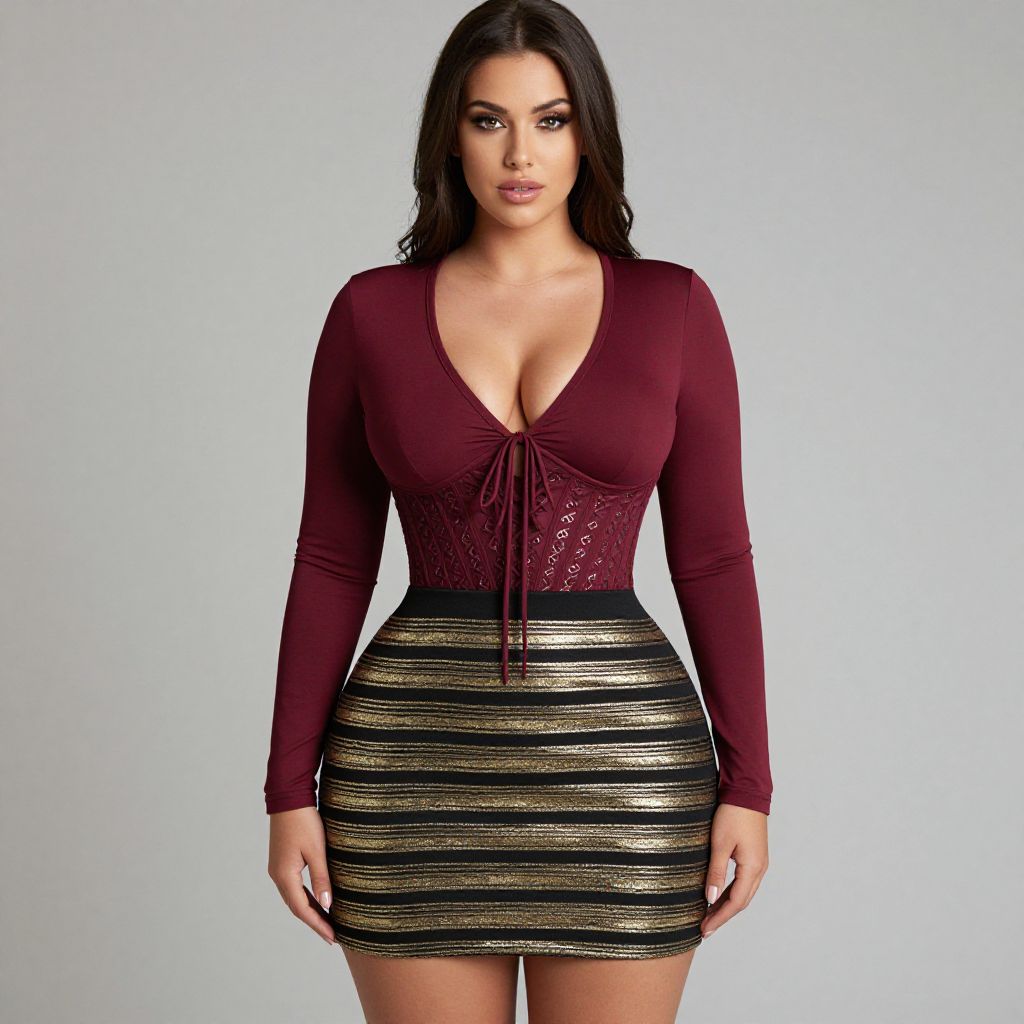 "Woman, trendy fashion, lace-up bodice with deep V-neck in burgundy, long sleeves, fitted silhouette, metallic striped mini skirt in horizontal pattern, colors black and gold, no visible accessories.. Sexy. Pretty face and beаutiful eyes. Big breasts."
