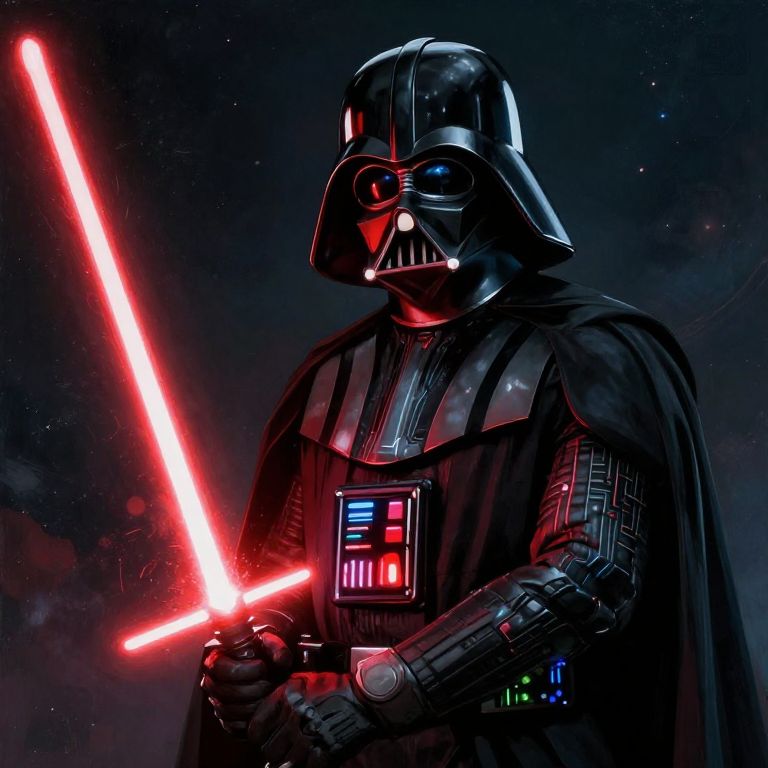 Digital art of Darth Vader holding a glowing red lightsaber against a dark, starry background, wearing his iconic black armor and cape.