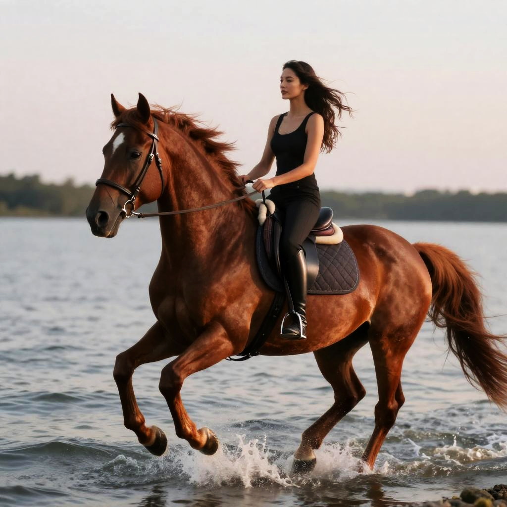 Realistic photo.A stunning chestnut mare prancing with an elegant woman sitting gracefully on its back, showcasing the gleam of its coat and flowing mane. Set against a tranquil lake at twilight, with gentle ripples creating a serene effect. The scene is illuminated with soft, dreamlike light tones, emphasizing a hyper-realistic style. Rendered with high detail and resolution, using lumen and professional photo effects for hyperrealism. Shot at f/11 and 1/250s, the digital painting is realistic, sharp, and highly detailed, creating an enchanting, fantasy-like atmosphere. realistic photo