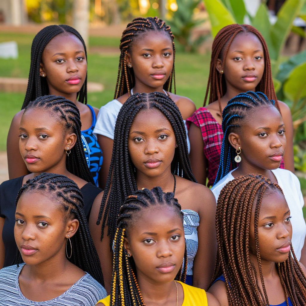 African braids hairstyles pictures featuring a diverse range of braided styles including Ghana braids, Senegalese twists, and micro braids, styled elegantly with colorful threads and accessories, portrayed in a lush outdoor setting with warm sunlight.