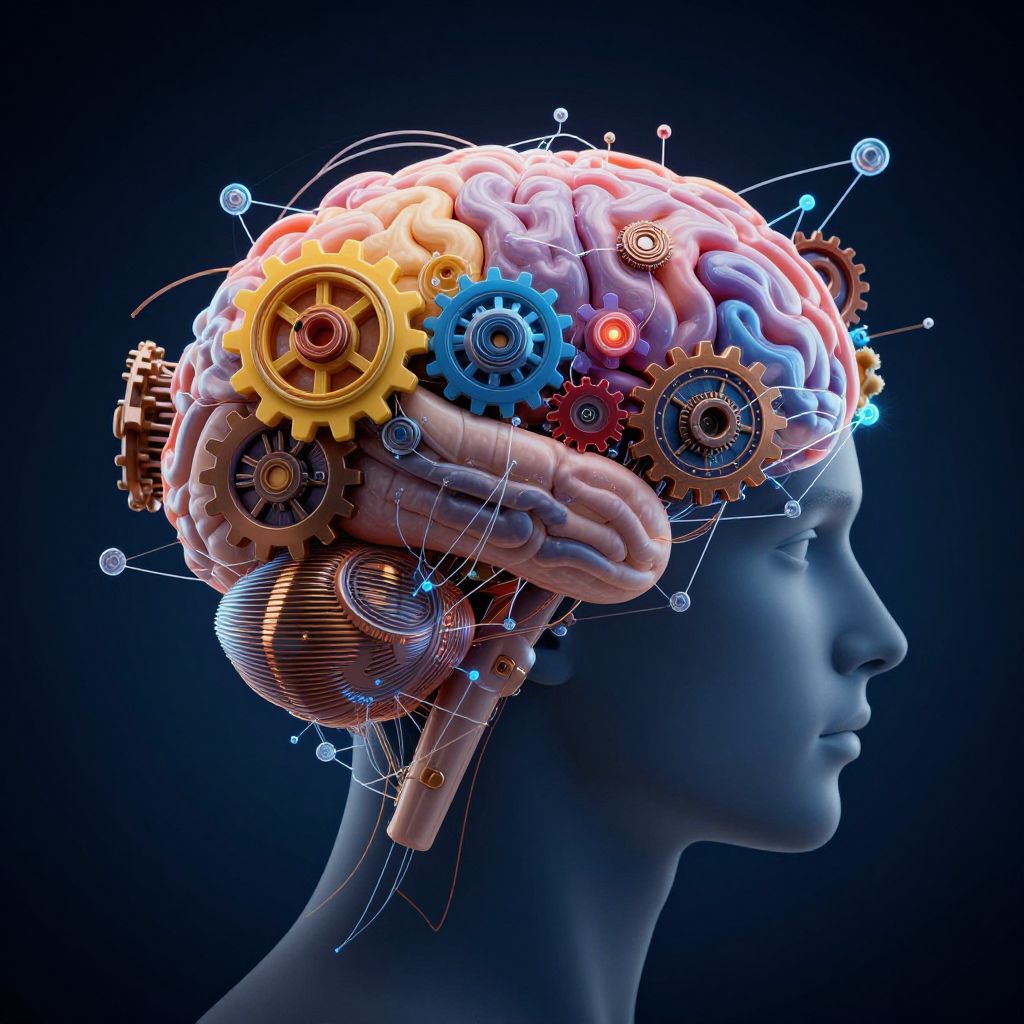Caravaggio a 3d pink brain with a brass padlock attached to it sitting on a black blue surface with an antique key,