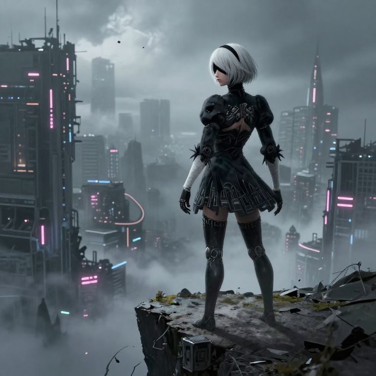 Nier concept art centered on a mysterious android protagonist standing on a cliff edge overlooking a vast, decayed metropolis, atmospheric fog and neon glows in the background, detailed character expression showing determination and solitude in a cybernetic world.