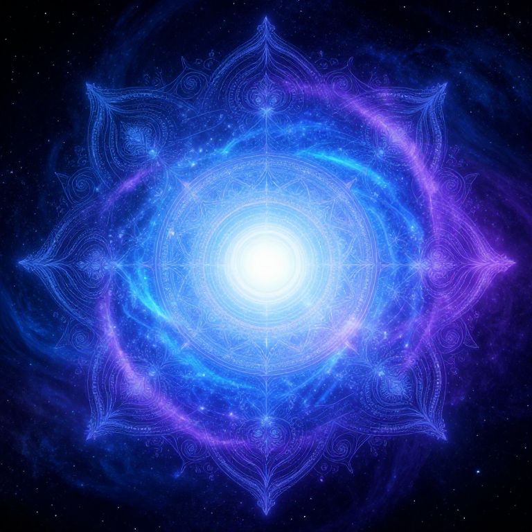 Mucha gra cosmic dreamscape with celestial motifs and swirling stars, a figure surrounded by ornate mandalas and floral vines, luminous gradients of blue and purple, intricate details creating depth and mysticism, merging natural beauty with cosmic wonder