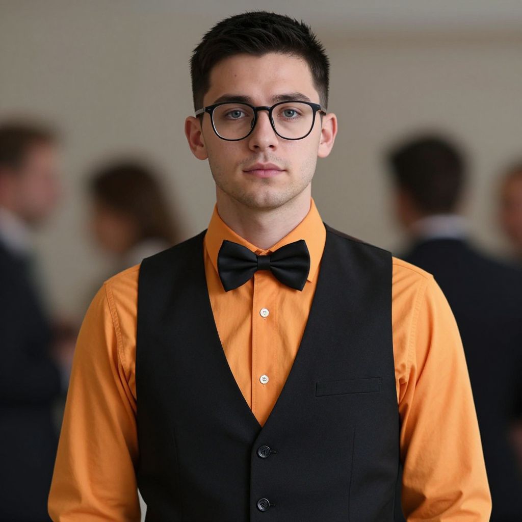 Photograph of a young Caucasian man with short, dark brown hair and blue eyes, wearing black-framed glasses. He is dressed in a vibrant orange dress shirt, a black bow tie, and a black vest with black buttons. The background is blurred, showing several out-of-focus people in dark clothing. The man's expression is neutral, and the overall image has a sharp focus on the subject, with a shallow depth of field. The lighting is even, highlighting the bright orange shirt against the darker vest and bow tie.