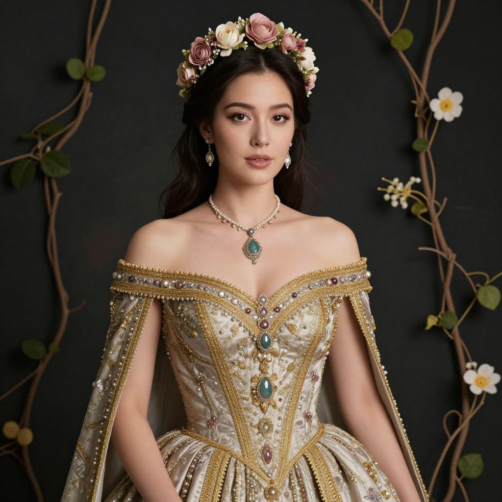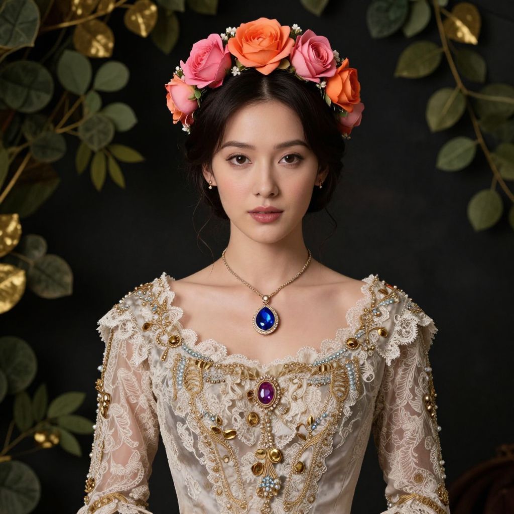 Elegantly poised, a woman adorned in a vintage gown embellished with intricate lace details and gold accents, wears a floral crown of vibrant pink and orange roses, complemented by a delicate necklace featuring a striking blue gemstone pendant, set against a dark backdrop adorned with lush green foliage and golden accents.