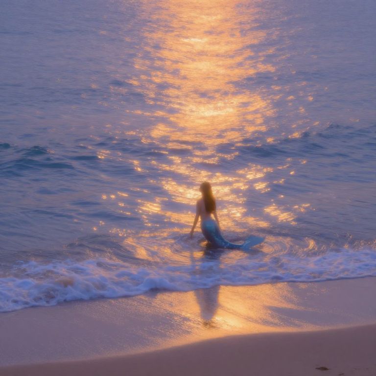 A serene beach landscape at twilight, bathed in the soft glow of an otherworldly light show. From above, witness the enchanting dance between water and illumination as ripples reflect the mesmerizing hues onto the shore, crafting a captivating mosaic of warmth and peace that instills a sense of wonder and tranquil reverence. In this Impressionist-inspired scene, a solitary mermaid gracefully emerges from the ocean waves, her ethereal beauty captured through delicate brushstrokes reminiscent of Monet's technique, as she becomes one with the luminous spectacle unfolding above.