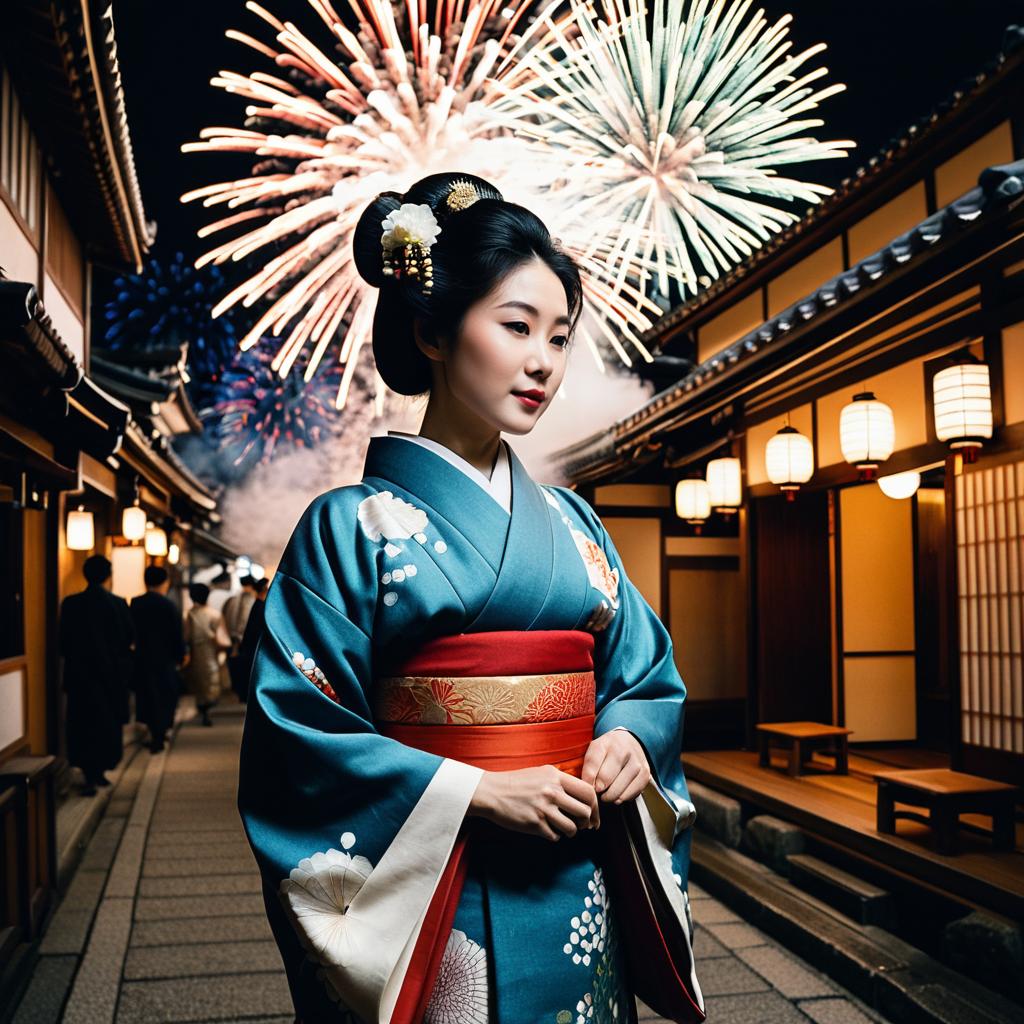 Elegant Geisha in Traditional Kaiseki Attire with Fireworks