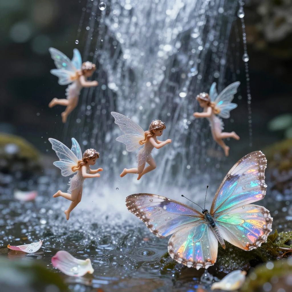 Celestial starlit crystal waterfall with suspended droplets, endearing minute glistening water nymphs with gossamer fins prancing among petals, a butterfly in the foreground formed from iridescent aquatic silk threads, dewdrops glitter, intricate textures, iridescent colors, macro realism, magical realism, hyperrealistic, volumetric light, soft bokeh, tactile details, storybook yet believable, 8k clarity