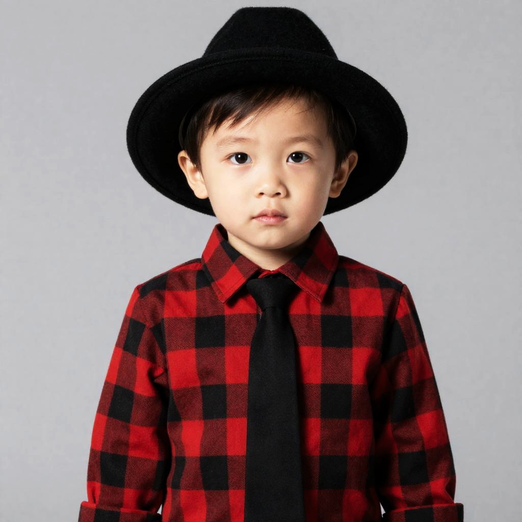 Toddler Ruthless Gangster Costume, toddler wearing a black hat and a red and black plaid shirt and tie