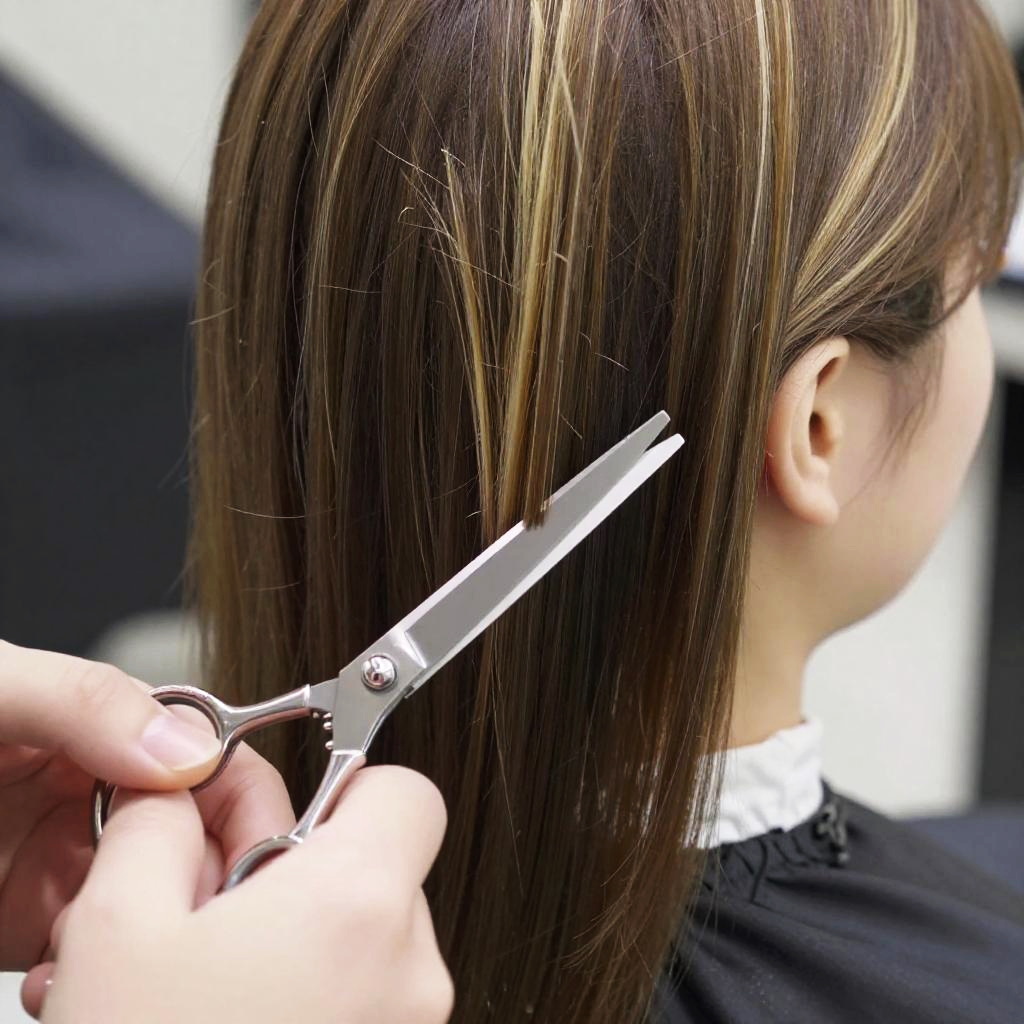 Close-up photograph of someone getting a trim in a hair salon. The focus is on their straight, brown hair with blonde highlights, being carefully cut with metallic scissors held by a hand with light skin. The person's ear is partially visible on the right. They're wearing a white shirt collar under a black jacket. The background is blurred, keeping the attention on the hair-cutting process.