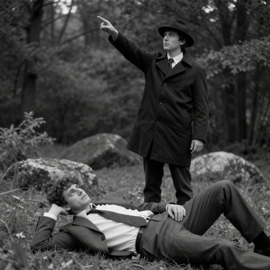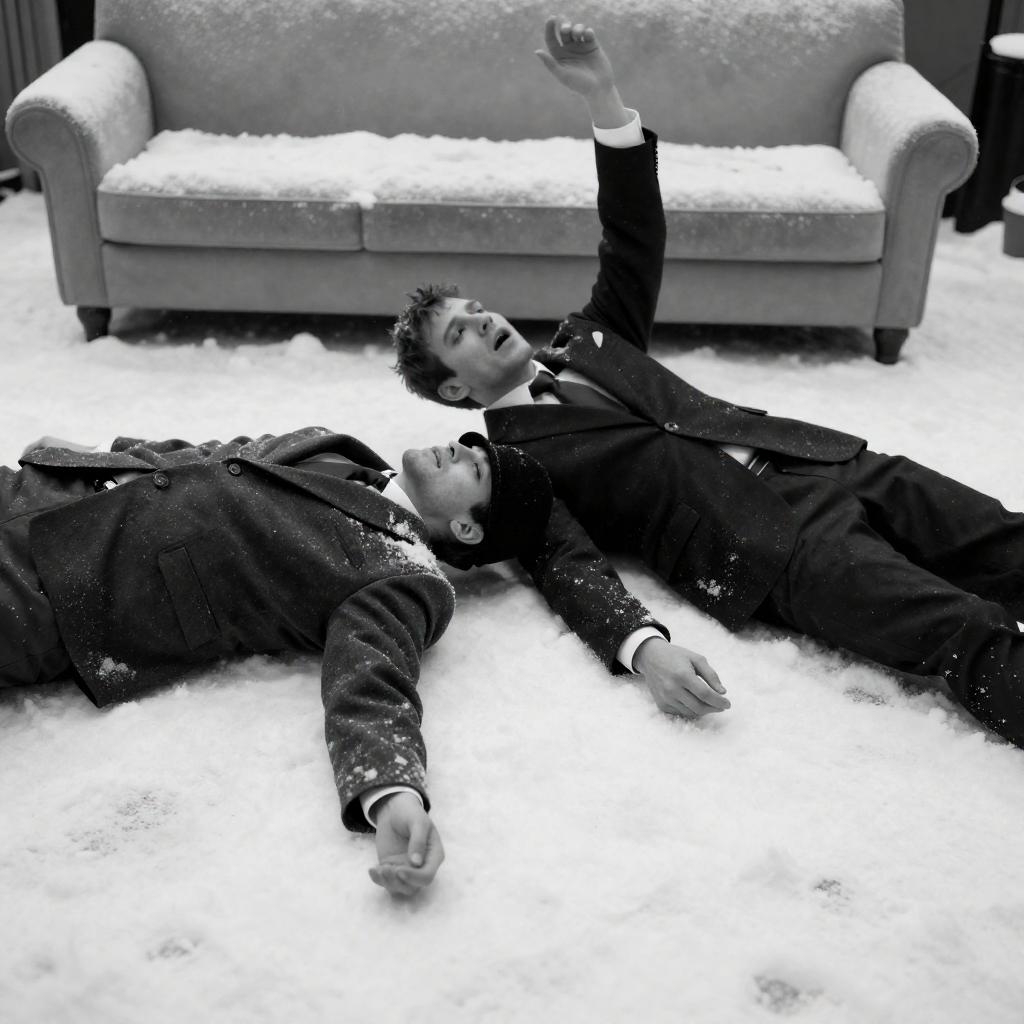 Black-and-white photograph of two men on a snowy floor. One man in a dark suit lies on his back with an arm raised, mouth open. The other man in a dark suit and hat lies beside him, face partially obscured. Snow-covered couch in the background. Both men have short hair. Snow creates a ured, white surface.