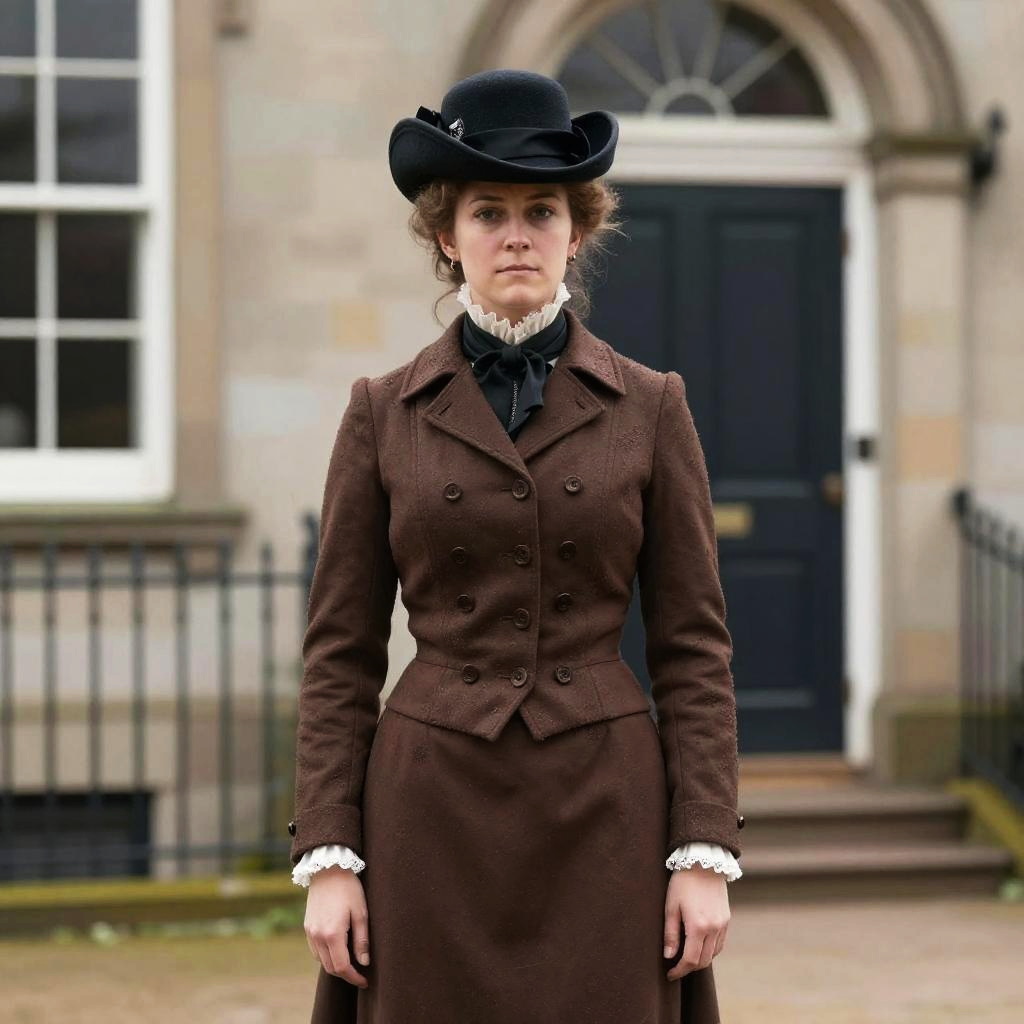 Victorian Costume History, woman in a brown vest and hat standing in front of a building