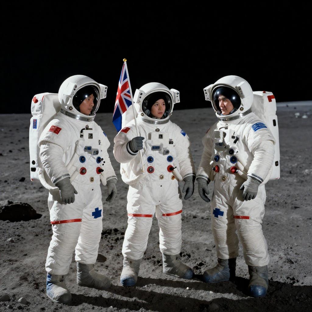 Photograph of a smiling astronaut in a white spacesuit with a large, clear helmet standing on a rocky, starry lunar surface. The astronaut holds ropes attached to the suit. A green, dome-shaped structure is visible in the background.