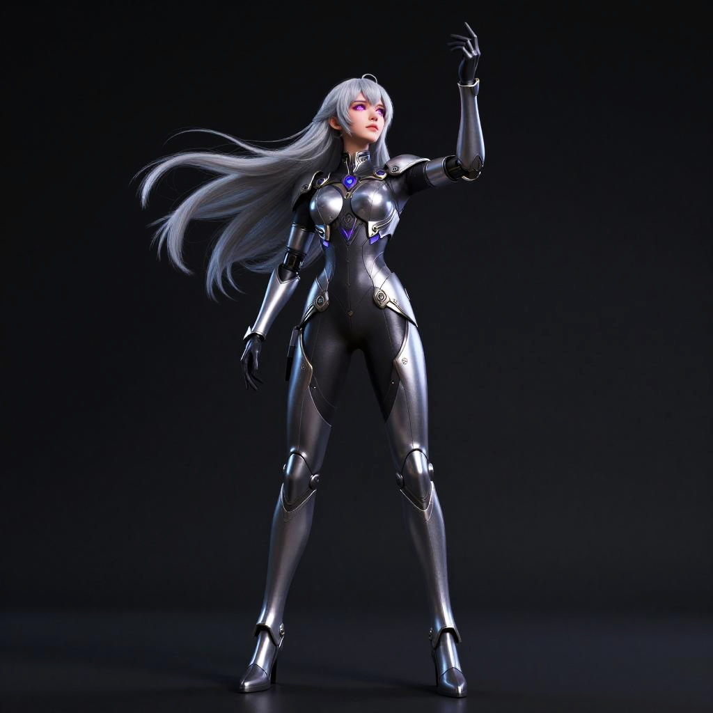 Full body, solo, statuesque figure with flowing silver hair and piercing violet eyes, sleek futuristic armor with glowing accents, standing tall with one hand raised towards the sky, black background