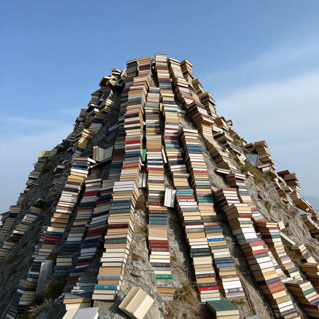 A towering mountain of books, each page whispering stories of countless lives, stands as a testament to the weight of knowledge and the enduring power of human curiosity, while the rhythmic rise and fall of its peaks evoke a collective breath of shared wisdom and introspection.