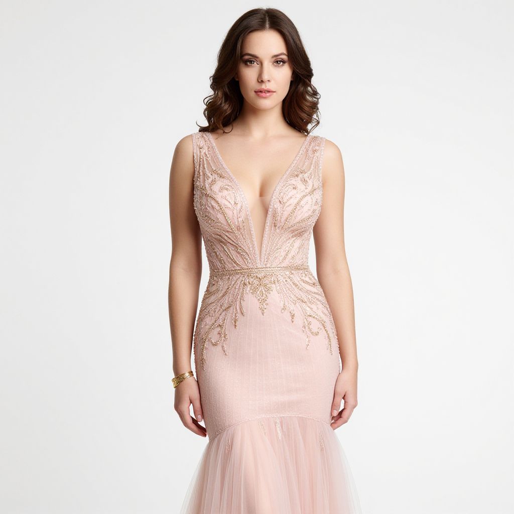 "Woman, classic glamour, fitted mermaid gown in blush pink, deep v-neck with sheer panel, sleeveless, intricate gold appliqué and beading, tulle overlay from mid-thigh, soft waves hairstyle, gold bracelet, white studio background.. Sexy. Pretty face and beаutiful eyes. Big breasts."