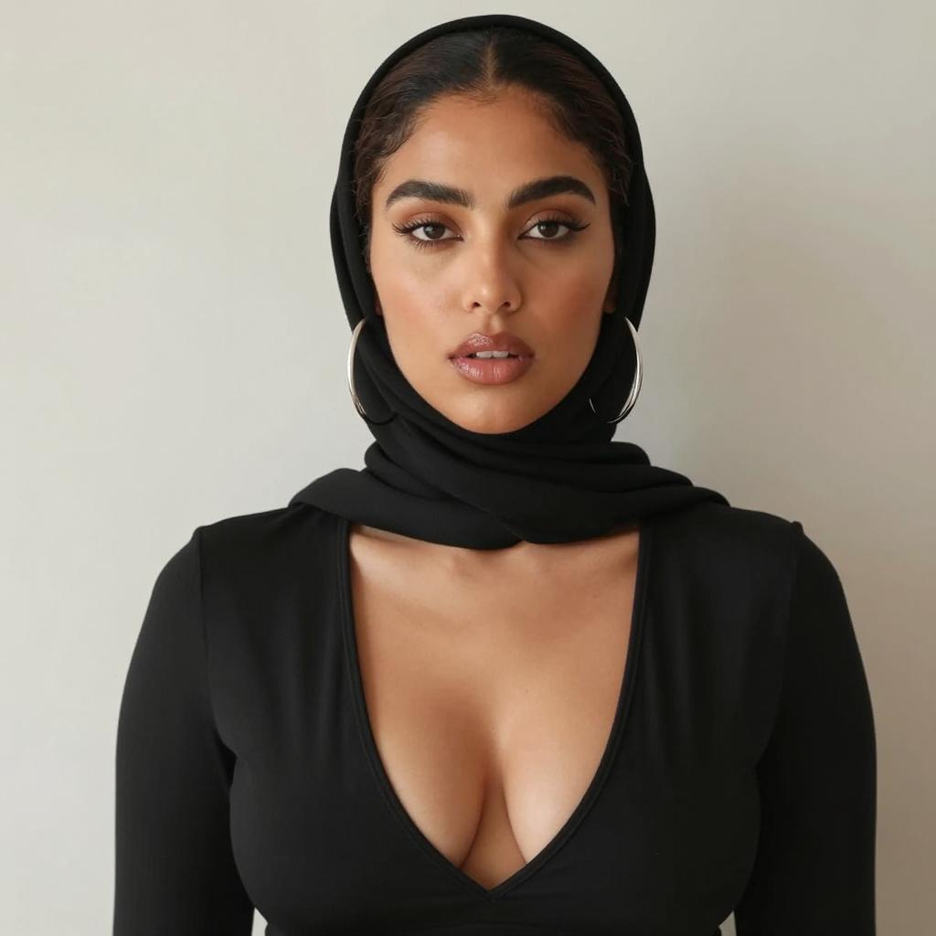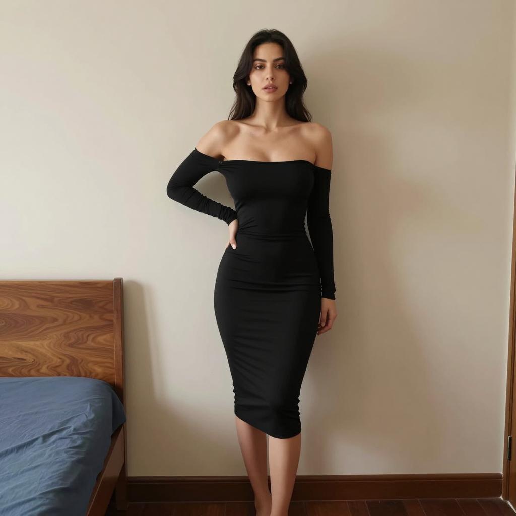 Photograph of a woman with long dark hair in a ponytail, wearing a strapless brown dress and green high heels. She is squatting against a plain gray wall with her back against it, legs apart. The floor is tiled. Her expression is neutral. She has a slender build and light brown skin.