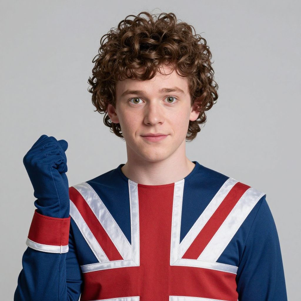 Photograph of a young Caucasian man with curly brown hair, wearing a Union Jack shirt, navy gloves, and a neutral expression, against a plain light