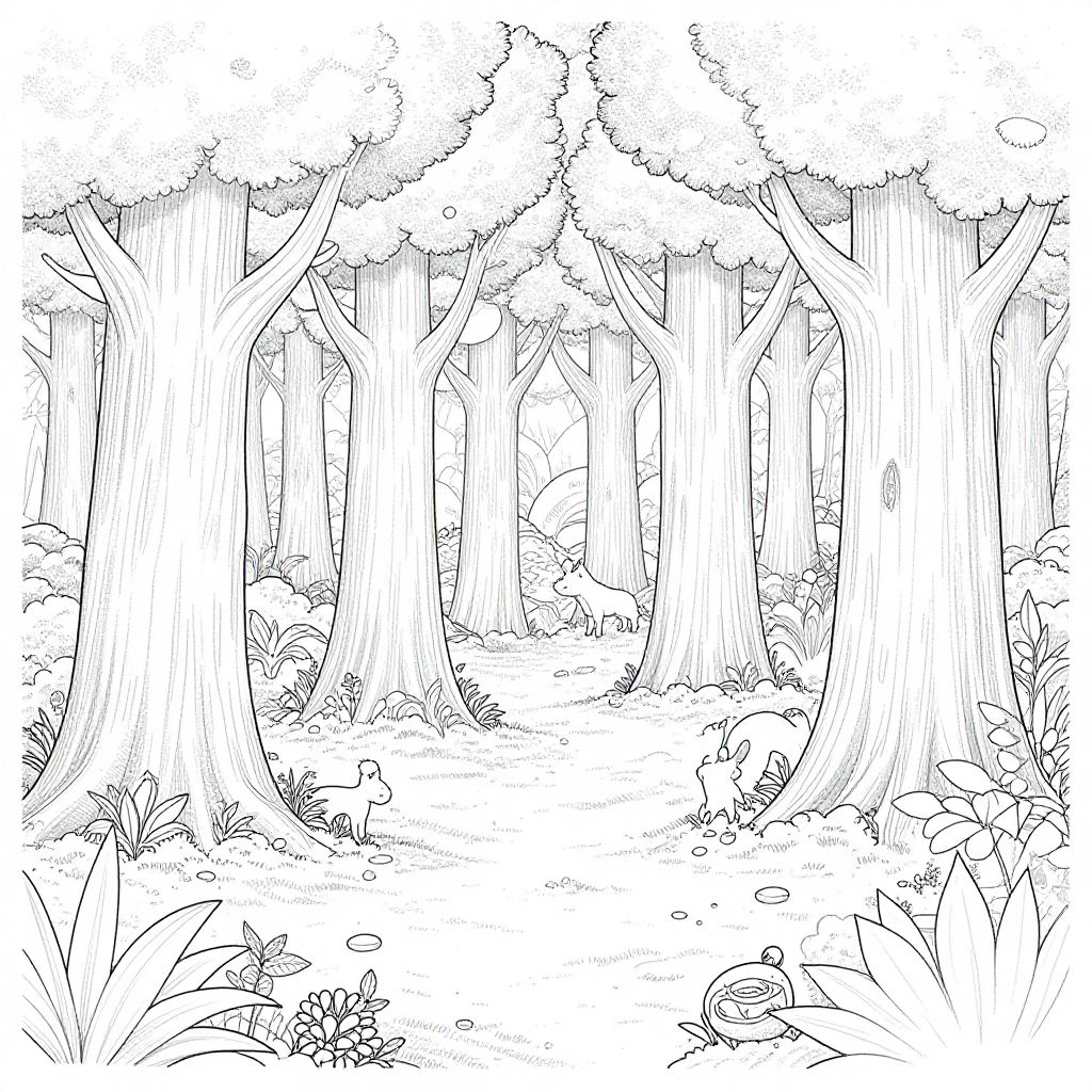 This black-and-white line drawing depicts a dense forest scene. Tall, thick trees with textured bark and wide, sturdy trunks dominate the background, their canopies forming a leafy, slightly overlapping roof. In the foreground, a variety of plants and small shrubs with detailed, individual leaves and flowers are scattered across the forest floor. The forest path, subtly indicated by a slightly lighter line, winds through the center, leading the eye deeper into the scene. The drawing uses clean, precise lines and a consistent thickness, creating a detailed yet simplistic and elegant illustration.