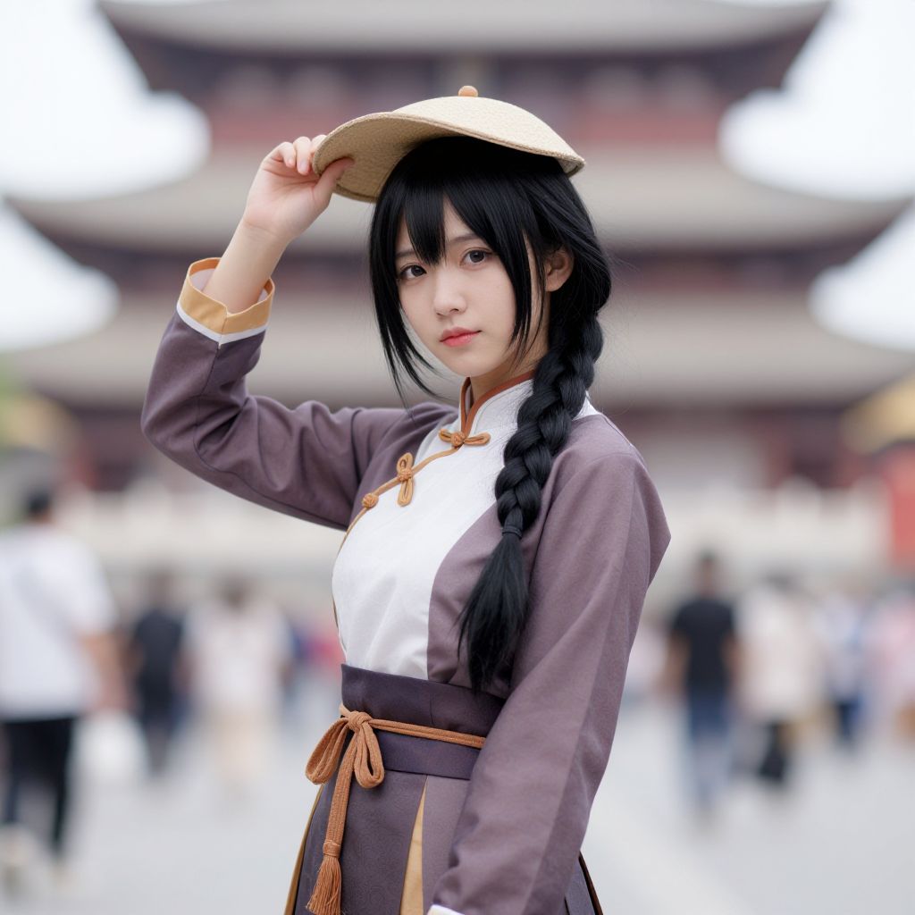 Photograph of an Asian woman cosplaying as a traditional Chinese character. She has long black hair in a braid, wears a beige conical hat, and a brown and white traditional Chinese outfit with gold trim and a brown sash. She stands in a blurred outdoor setting with traditional Chinese architecture in the background. Her expression is neutral, and her right hand is lifting the hat slightly. The background includes indistinct figures and a bright, sunny atmosphere. The image has a soft focus effect, emphasizing the subject while blurring the surroundings.