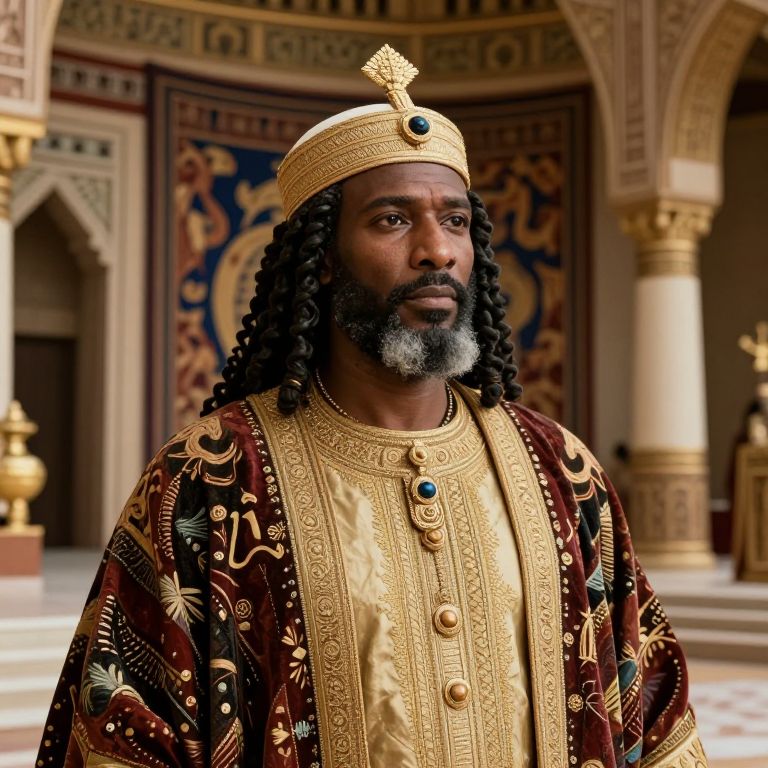 A detailed scene of Soundiata Keita, founder of the Mali Empire, in a grand royal palace adorned with rich tapestries and symbols of African royalty, a wise and strong expression on his face, ancient West African architecture and cultural elements in the background.