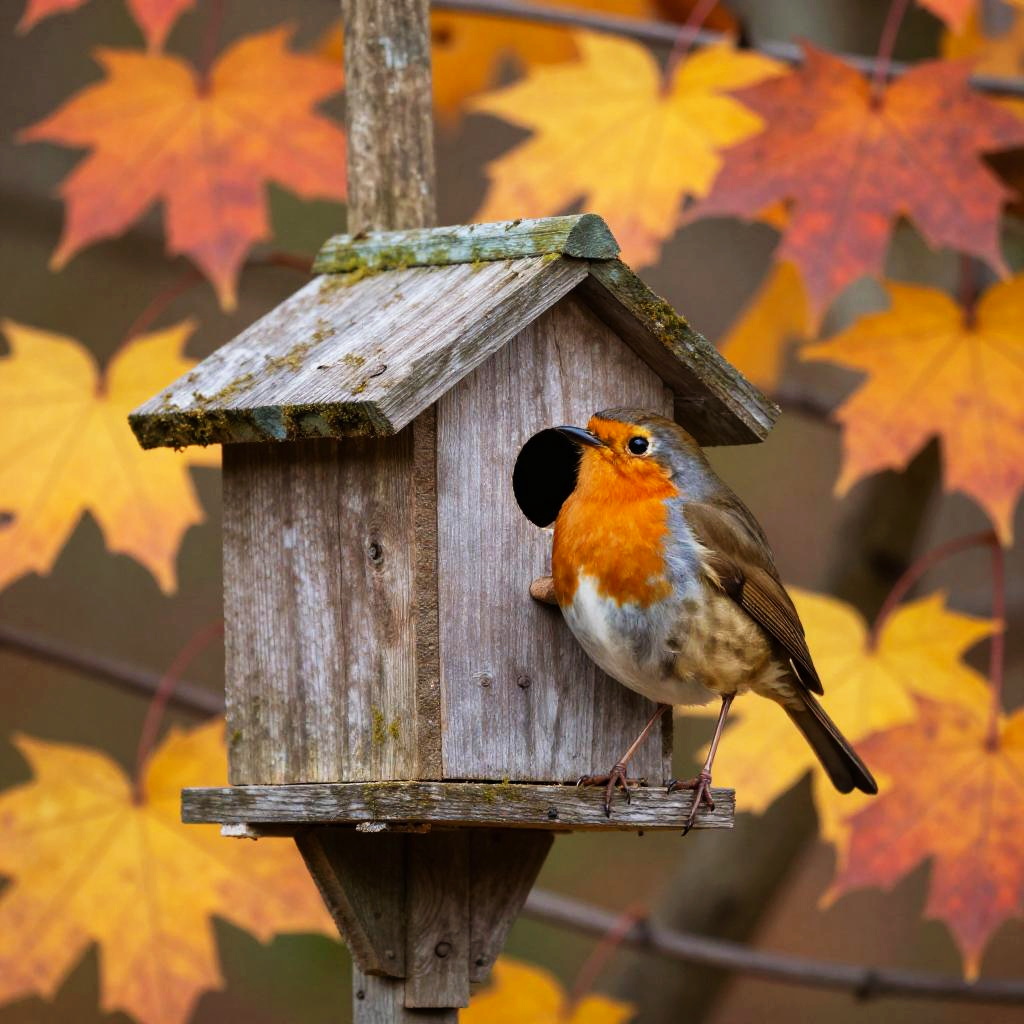 Photograph of a vibrant European robin with an orange chest, brown and gray feathers, perched on a branch against a softly blurred background.