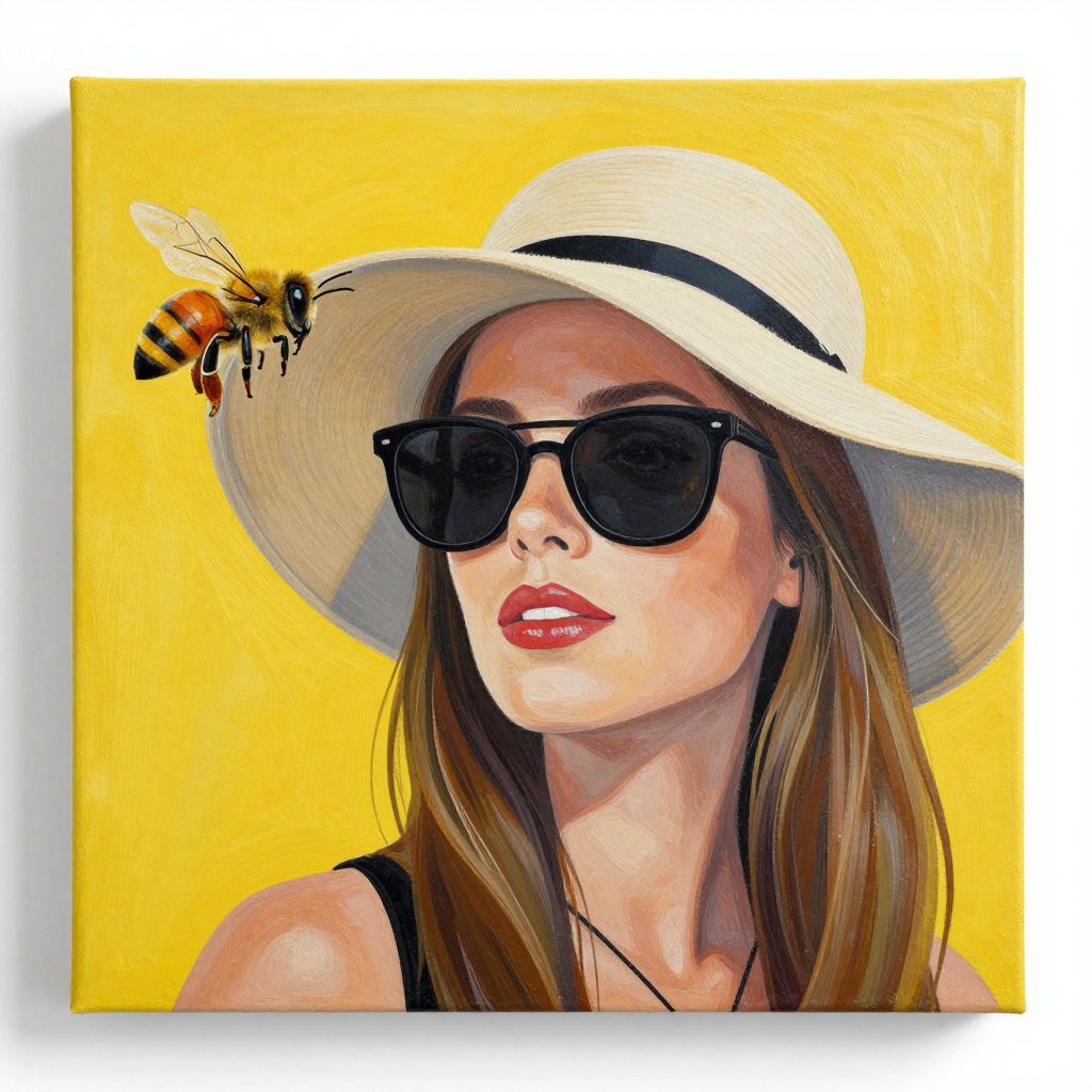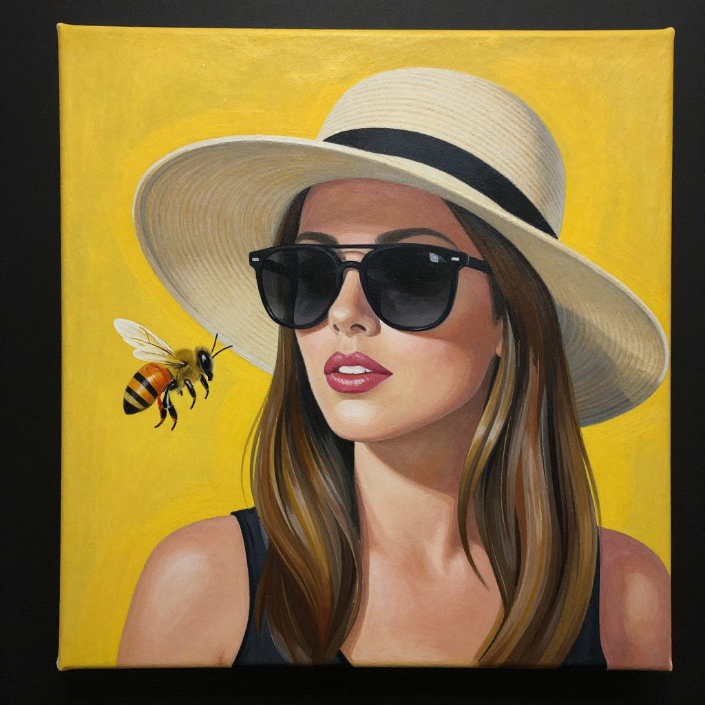 This digital painting portrays a young woman with fair skin, wearing a white wide-brimmed hat with a black band, black sunglasses, and a black tank top. Her brown hair is straight and reaches past her shoulders. She has full, pink lips slightly parted. A bee with a yellow and black striped body and transparent wings is hovering near her left ear. The background is a solid, bright yellow, creating a striking contrast with her attire and the bee. The artist uses bold, vivid colors and sharp, defined lines, giving the image a modern, pop-art style. The painting is framed in black.
