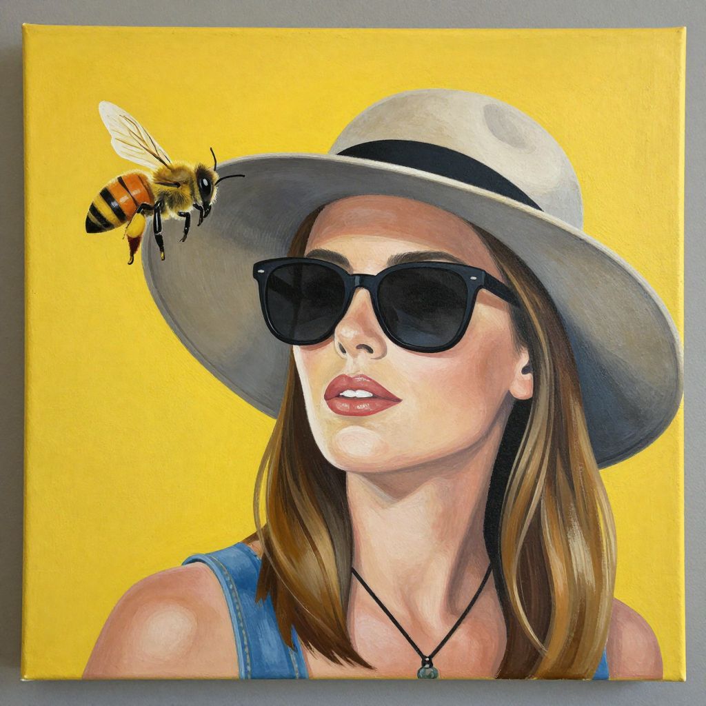 Self-portrait featuring a woman wearing a wide-brimmed hat and sunglasses, set against a vibrant yellow background, with a detailed bee flying to her left, rendered in acrylic on a 16\" x 20\" canvas.