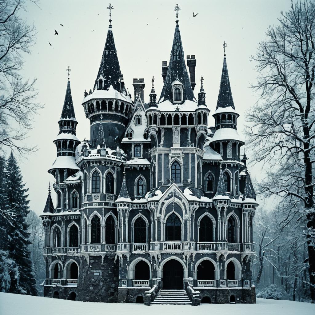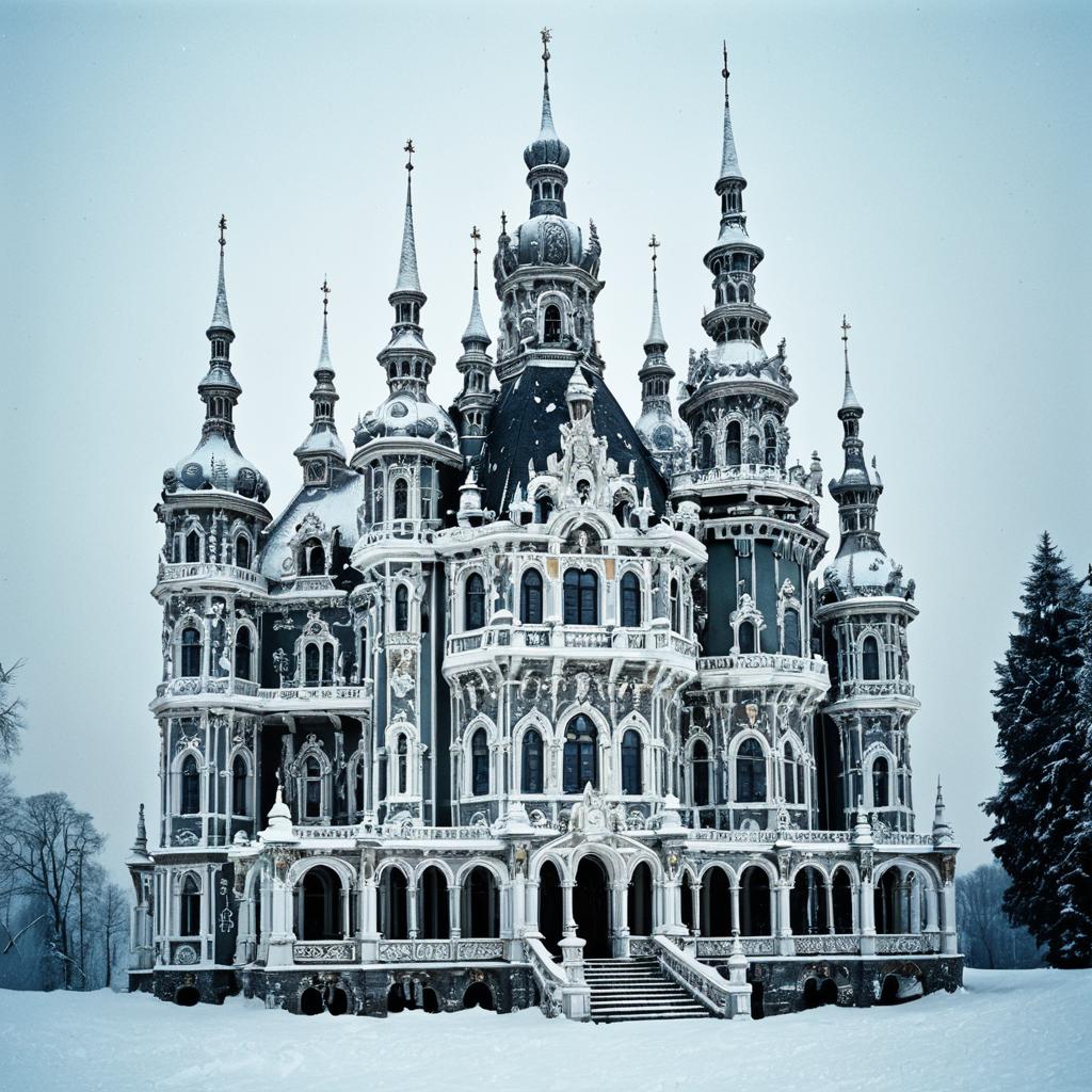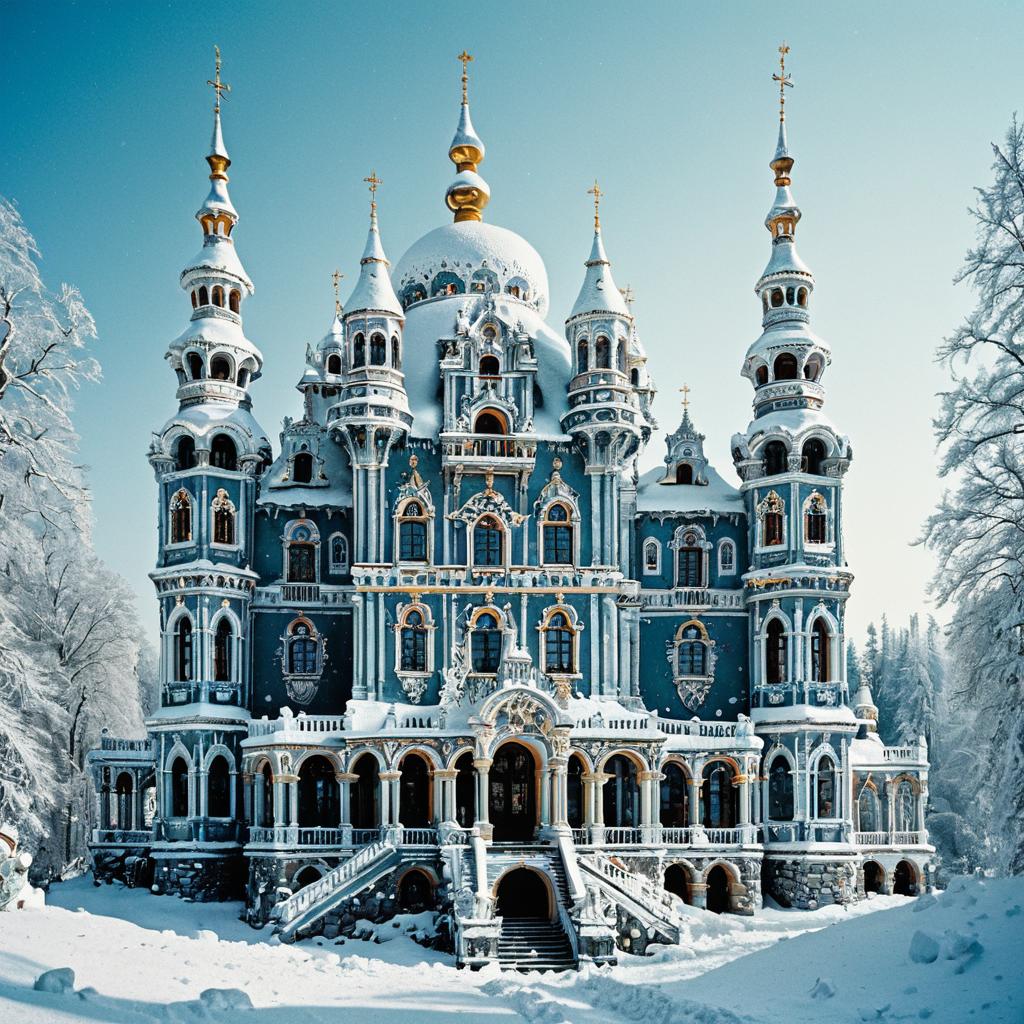 Chromolithograph a snow covered castle with arches and stained glass windows, in the style of baroque fantasy, textured and weathered, eroded interiors, mystical portraits, rococo interiors, sculptural landscapes,