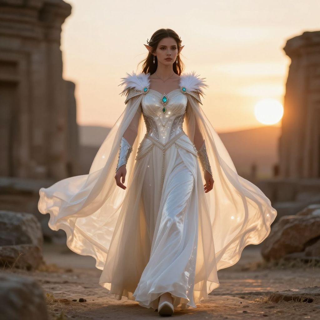 This photograph depicts a tall, slender woman with pale skin and dark, wavy hair. She is wearing an elegant, white, floor-length gown with a fitted, beaded bodice and a flowing, sheer cape adorned with white, feather-like embellishments. The gown features a central turquoise gem on the chest and matching arm cuffs. She walks confidently towards the camera in a sunlit, ancient, stone ruin setting, with the golden sunset in the background. Her expression is serene and determined. The image has a fantasy, cinematic quality, emphasizing her regal, otherworldly appearance.