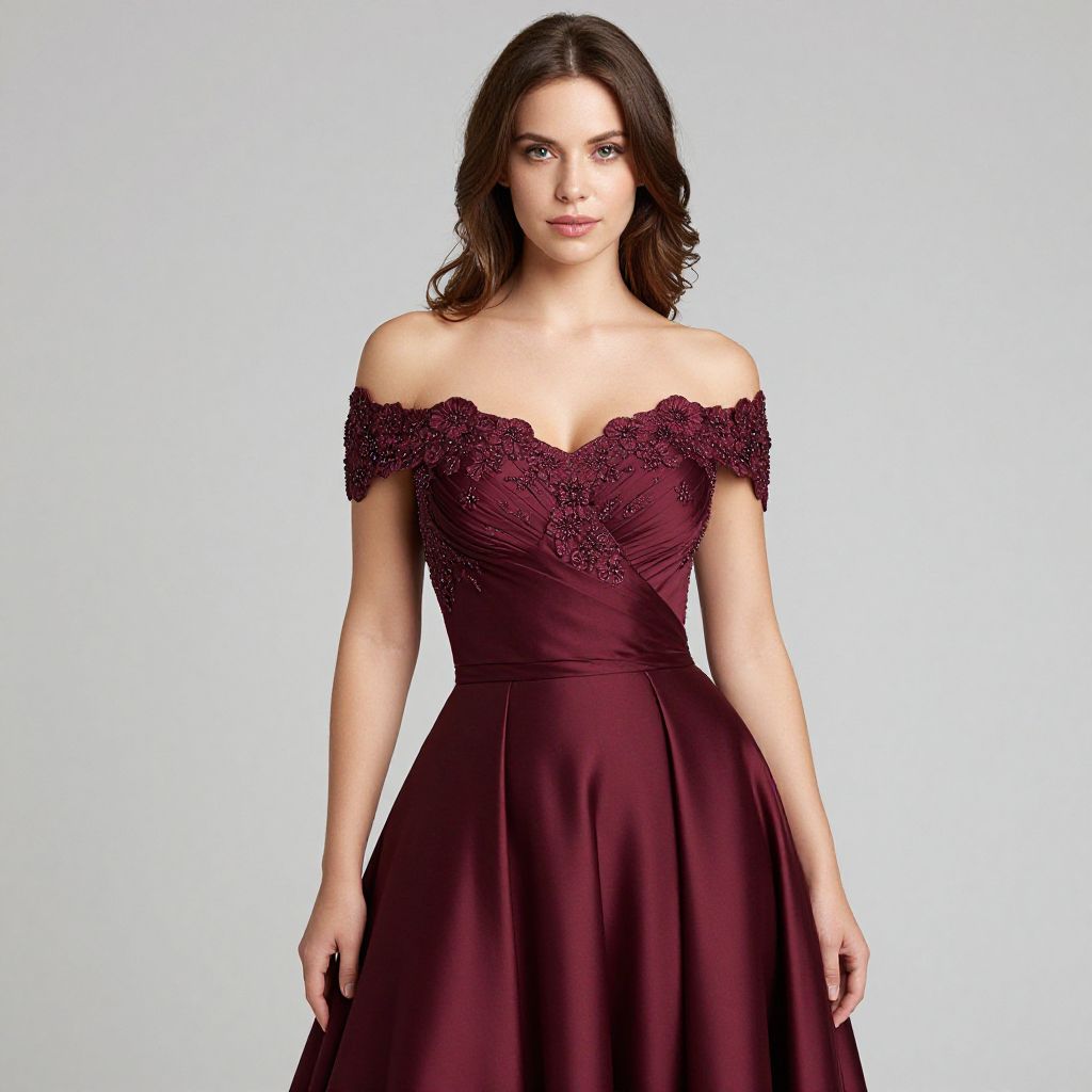 "Woman, formal evening wear, off-the-shoulder burgundy gown with a sweetheart neckline, capped sleeves adorned with embroidered lace and beadwork in a floral motif, fitted bodice transitioning into a full, floor-length satin skirt, plain background.. Sexy. Pretty face and beаutiful eyes. Big breasts."